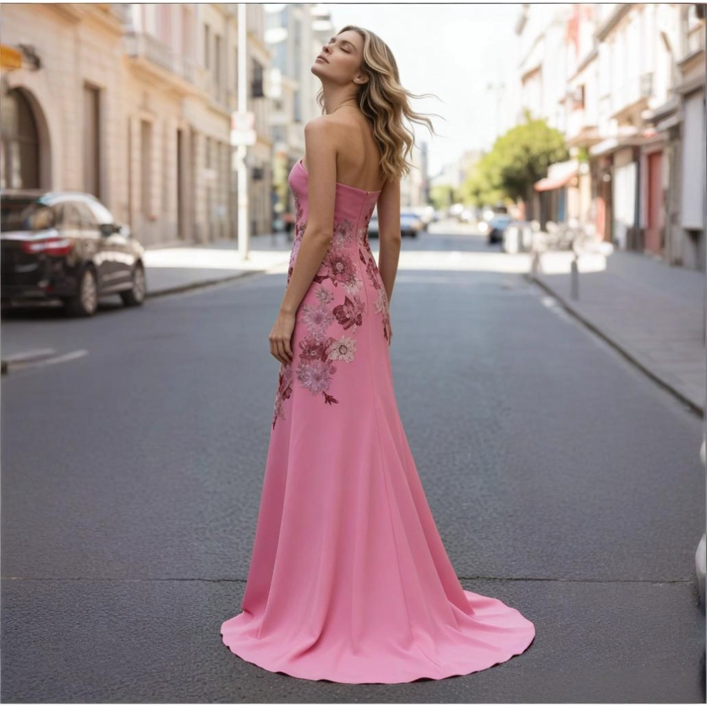 A pink strapless gown adorned with three-dimensional floral appliqués and sequins, featuring a romantic, eye-catching full skirt silhouette—the perfect choice for showcasing feminine elegance at evening events.