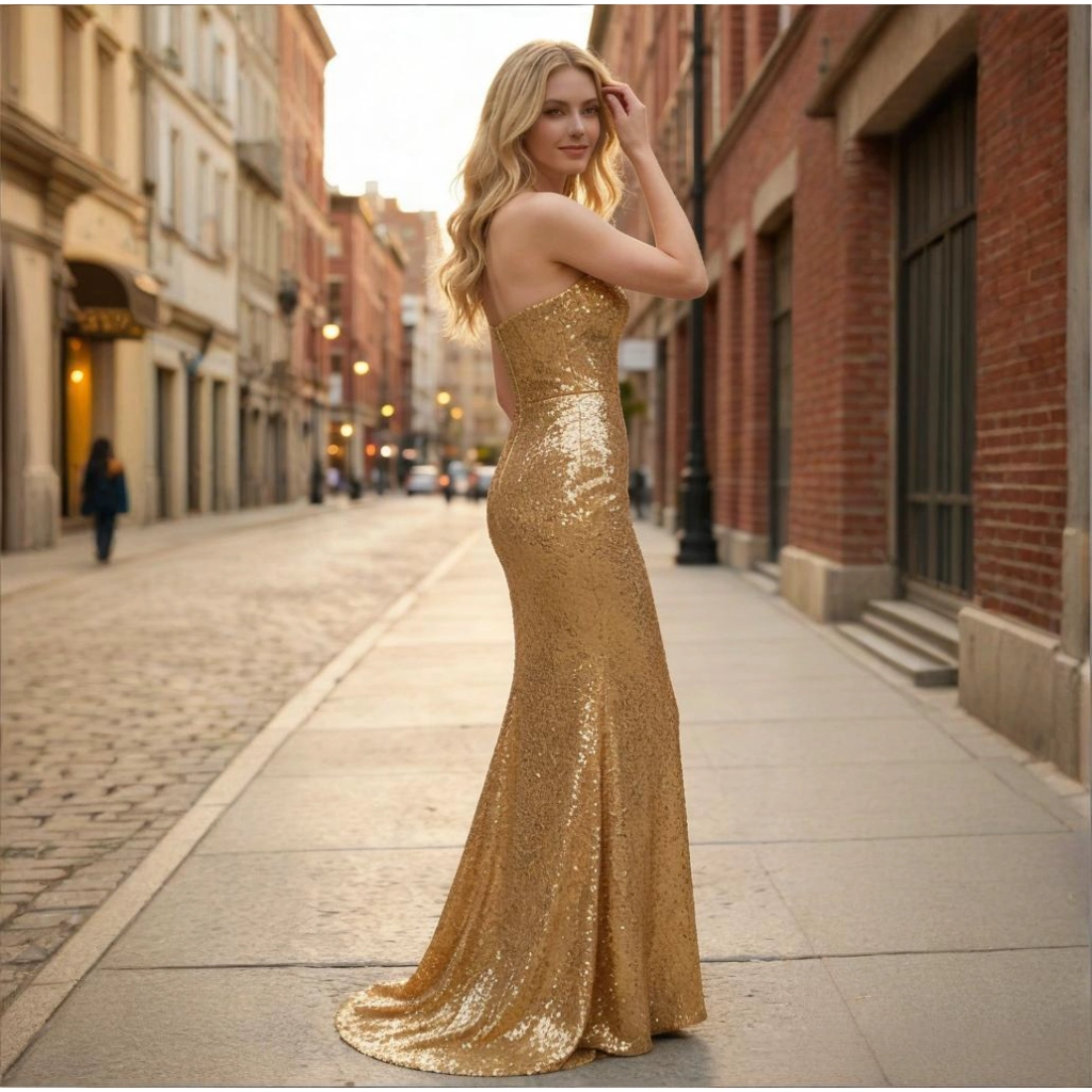 | Description | A golden sequined strapless gown with a form-fitting mermaid silhouette and trailing train exudes opulent grandeur, making it the epitome of regal elegance for celebratory occasions. | A nude pink lace gown with three-quarter sleeves, adorned with three-dimensional floral appliqués and a large bow. Its layered skirt exudes romantic elegance, making it the perfect choice for weddings and formal dinners to showcase feminine grace. | A nude-colored one-shoulder gown, featuring three-dimensional floral embellishments and a slit skirt, exudes elegance with its gracefully draping fabric. This sophisticated choice is perfect for weddings and celebrations, showcasing refined taste. | A deep blue layered gown features a square neckline paired with flowing chiffon sleeves. The waist is adorned with jeweled embellishments and sculpted pleats, creating a flattering silhouette that conceals curves while exuding sophistication. This elegant ensemble is the perfect choice for formal occasions. | A white-based gown with blue floral accents, featuring a fitted silhouette and belted waist. The intricate print exudes elegance, making it an ideal choice for banquets and celebrations to showcase distinctive taste. | A blue-and-white color-blocked off-the-shoulder gown features three-quarter sleeves and a waist belt. Its distinctive cape-style design exudes elegance, ensuring you stand out at formal events. |