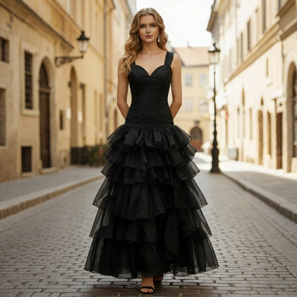 | Description | Black strapless V-neck gown with a tiered tulle skirt and cinched waist, exuding a dreamy, romantic charm. Perfect for bridesmaids or as the sweetheart of any lawn party. | A deep blue layered gown features a square neckline paired with flowing chiffon sleeves. The waist is adorned with jeweled embellishments and sculpted pleats, creating a flattering silhouette that conceals curves while exuding sophistication. This elegant ensemble is the perfect choice for formal occasions. | A purple-gray V-neck gown with bell sleeves and layered pleats, crafted from flowing fabric that exudes romance—the perfect choice for showcasing grace at evening events. | Navy blue one-shoulder evening gown with lace sleeves and pleated detailing. The elegant fishtail hem exudes sophistication, while exquisite craftsmanship ensures you radiate luxurious taste at banquets and weddings. | This light blue lace one-shoulder gown features exquisite, elegant long sleeves and an asymmetrical hemline that exudes unique charm. It is a captivating choice for evening events and parties, showcasing feminine grace and individuality.