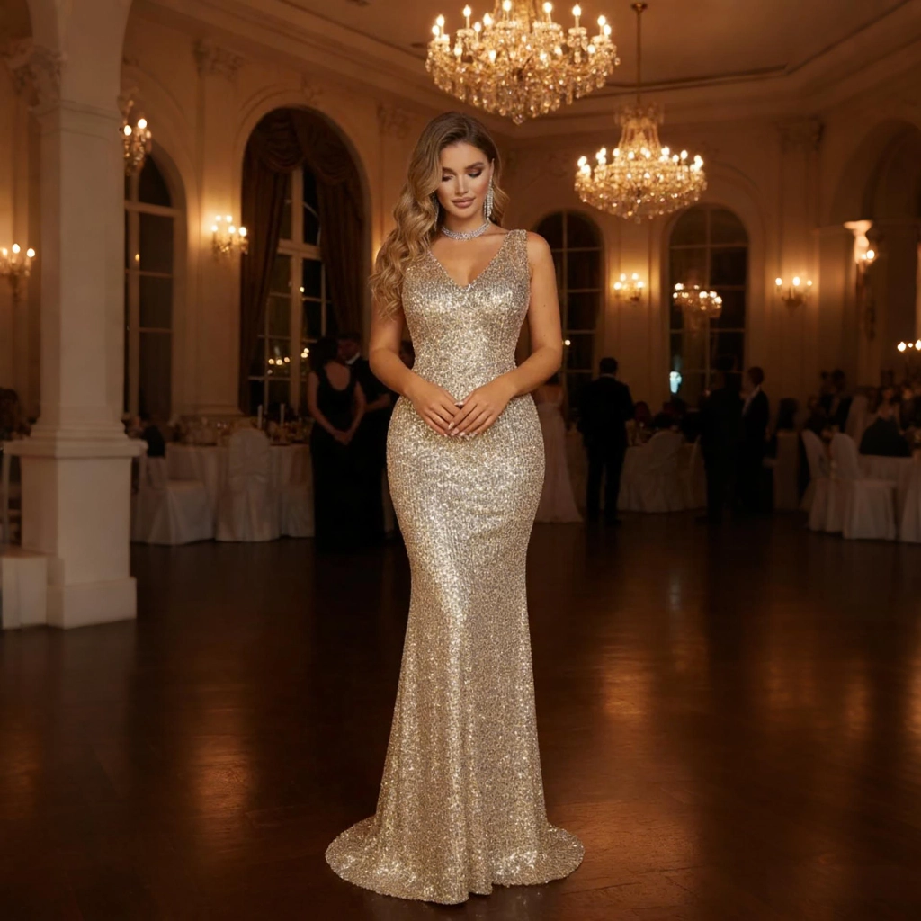 | Description | Fully covered in gold sequins + deep V-neck backless design, the fishtail skirt accentuates curves while the train enhances an aura of luxury. Step onto the banquet floor and become the center of attention. | A rose-pink one-shoulder gown with three-quarter sleeves and sculpted pleats, featuring an elegant, voluminous skirt silhouette. This striking choice radiates confidence at parties and formal dinners. | A nude pink lace gown with three-quarter sleeves, adorned with three-dimensional floral appliqués and a large bow. Its layered skirt exudes romantic elegance, making it the perfect choice for weddings and formal dinners to showcase feminine grace. | A rose-pink long-sleeved gown, featuring pleated detailing and diamond embellishments, with an elegant and sophisticated fishtail hemline—the perfect choice for weddings and celebrations to showcase opulence. | A royal blue feather-adorned gown, featuring layered cuts paired with jeweled embellishments and feather sleeves, boasts a distinctive design that radiates individuality. It's the perfect eye-catching piece to stand out at any party. | Navy blue one-shoulder gown with lace sleeves adorned with three-dimensional floral appliqués. The full skirt silhouette exudes elegance and grandeur, while exquisite details showcase your luxurious taste at the gala. |