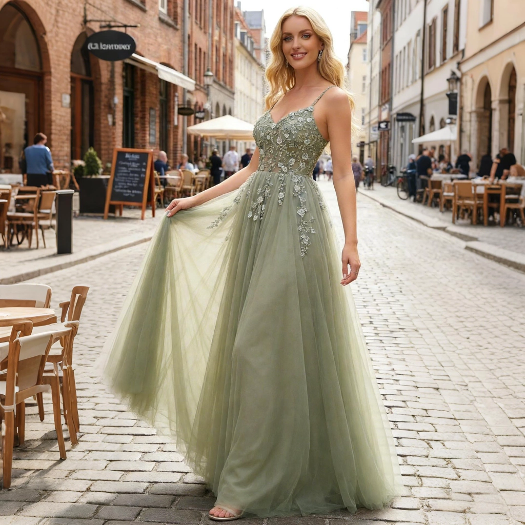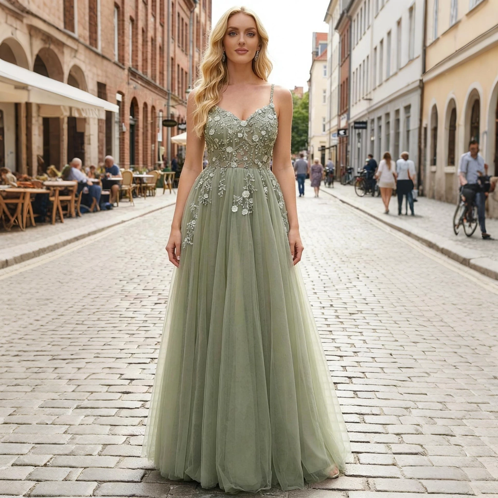 | Description | A gray-green embroidered beaded halter dress with delicate floral embroidery and a flowing skirt exudes gentle grace and ethereal charm—a standout ensemble for upscale gatherings that radiates an otherworldly elegance. | Black nude-paneled dress with sequined top and fishtail skirt. The three-quarter sleeves add a stylish, eye-catching touch, making it the perfect choice to stand out at weddings and celebrations. | This light blue lace one-shoulder gown features exquisite, elegant long sleeves and an asymmetrical hemline that exudes unique charm. It is a captivating choice for evening events and parties, showcasing feminine grace and individuality.
