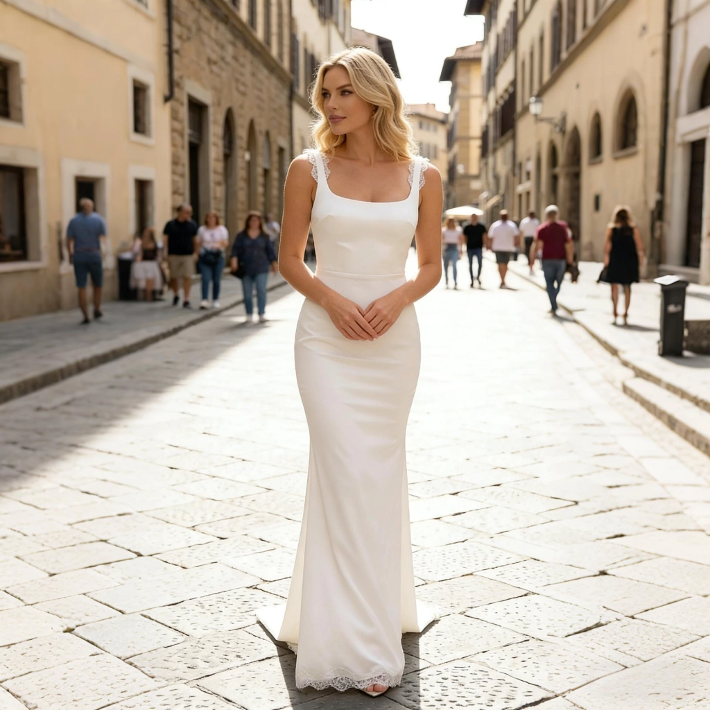 A white satin square-neck gown with embroidered accents and a trailing hem exudes elegance and refinement, making it a romantic choice for weddings that blends tenderness with regal sophistication.