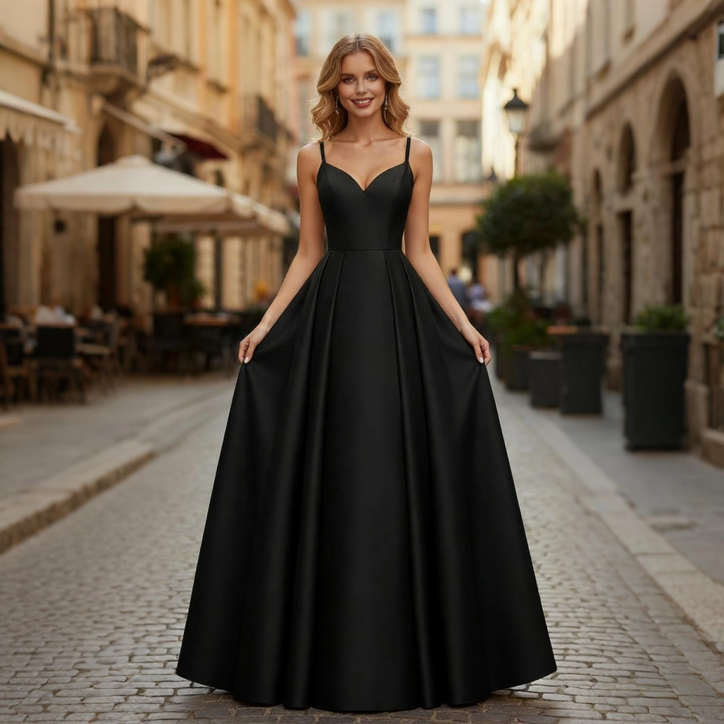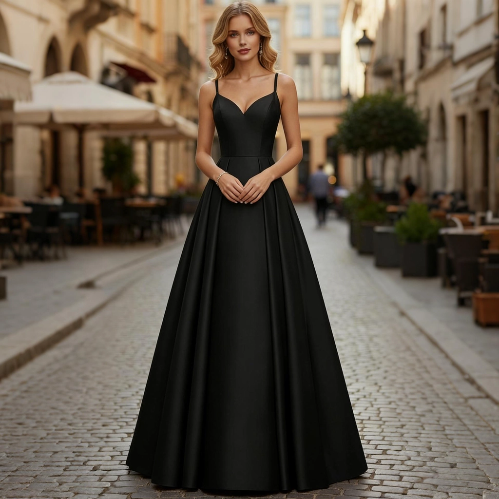 A black satin heart-neckline gown with delicate spaghetti straps and a full skirt design. Its vintage courtly elegance radiates sharp sophistication, making it a dazzling presence that commands the spotlight at balls or grand banquets.