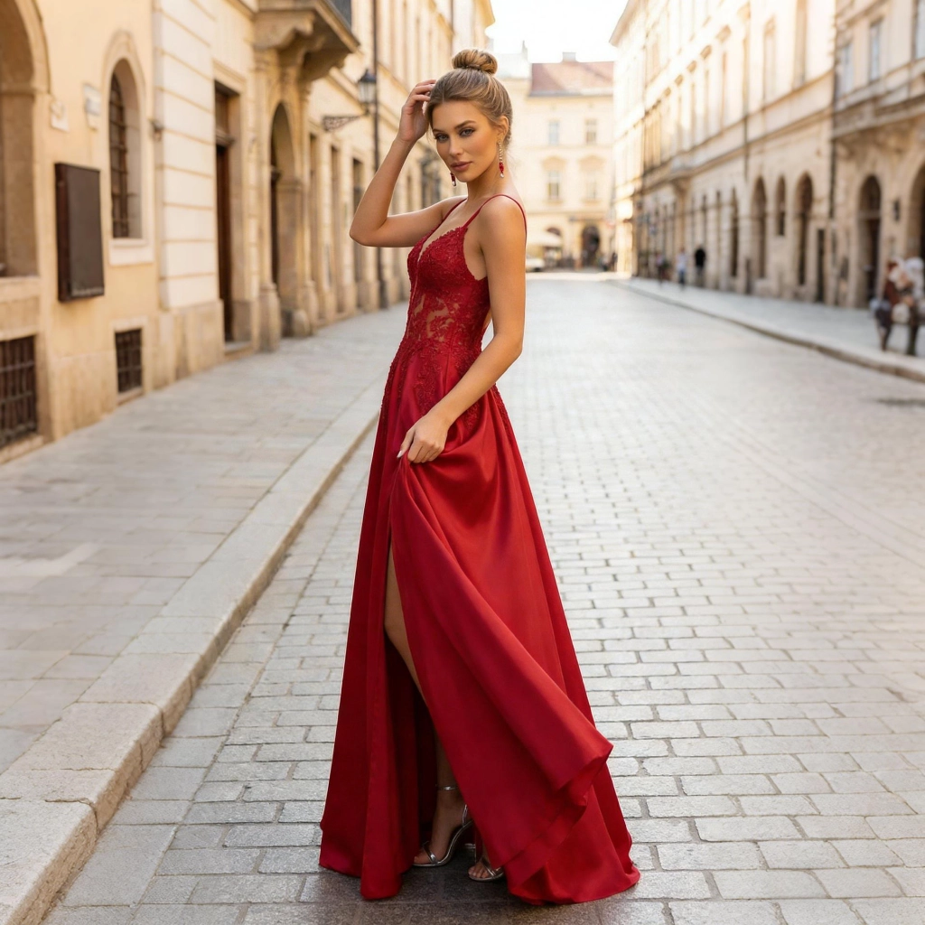 This gown seamlessly blends vintage charm with stunning allure, radiating an air of romance. Crafted from burgundy satin, it features a deep V-neck lace bodice paired with a cascading full skirt. The open back adds a touch of softness, while the cinched waist accentuates a slender silhouette. Its overall style blends vintage charm with romantic flair, making it an elegant choice for wedding guests or upscale parties. Retro yet stunning, this gown perfectly captures feminine grace and sophistication through its lace embellishments and open back.