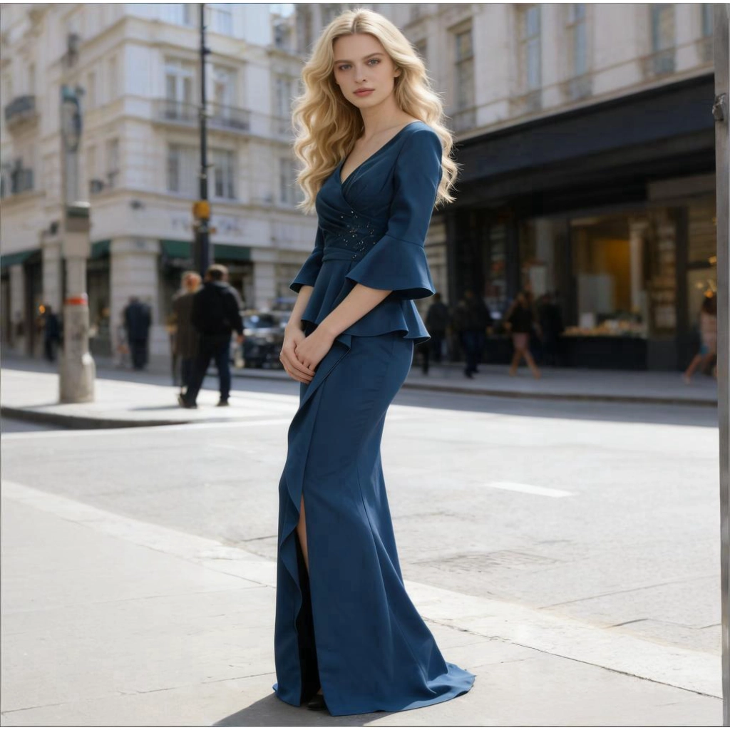 | Description | A deep blue V-neck gown with ruffled bell sleeves and diamond embellishments. Its tailored silhouette accentuates elegance, making it a captivating choice to showcase your taste at any evening event. | A rose-pink one-shoulder gown with three-quarter sleeves and sculpted pleats, featuring an elegant, voluminous skirt silhouette. This striking choice radiates confidence at parties and formal dinners. | This light blue lace one-shoulder gown features exquisite, elegant long sleeves and an asymmetrical hemline that exudes unique charm. It is a captivating choice for evening events and parties, showcasing feminine grace and individuality.