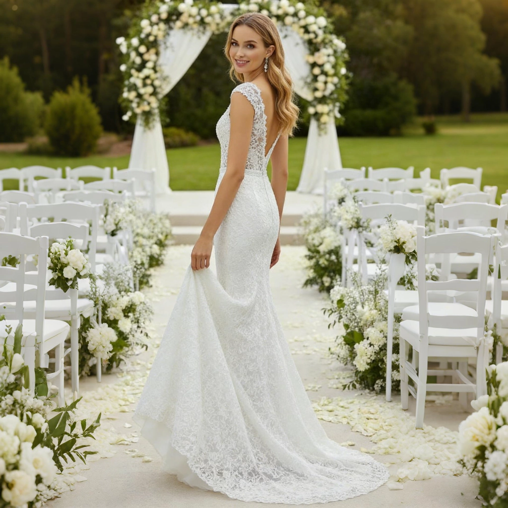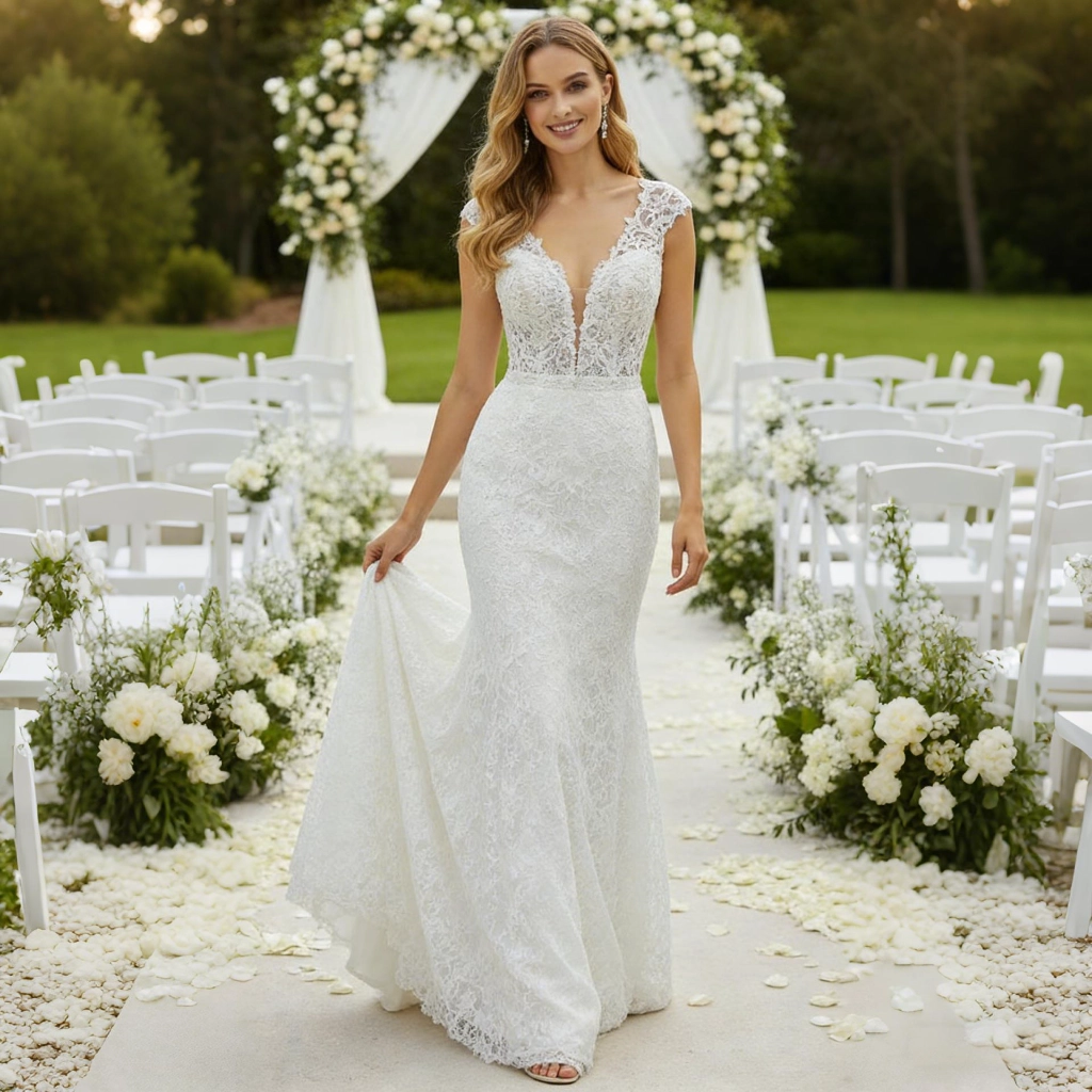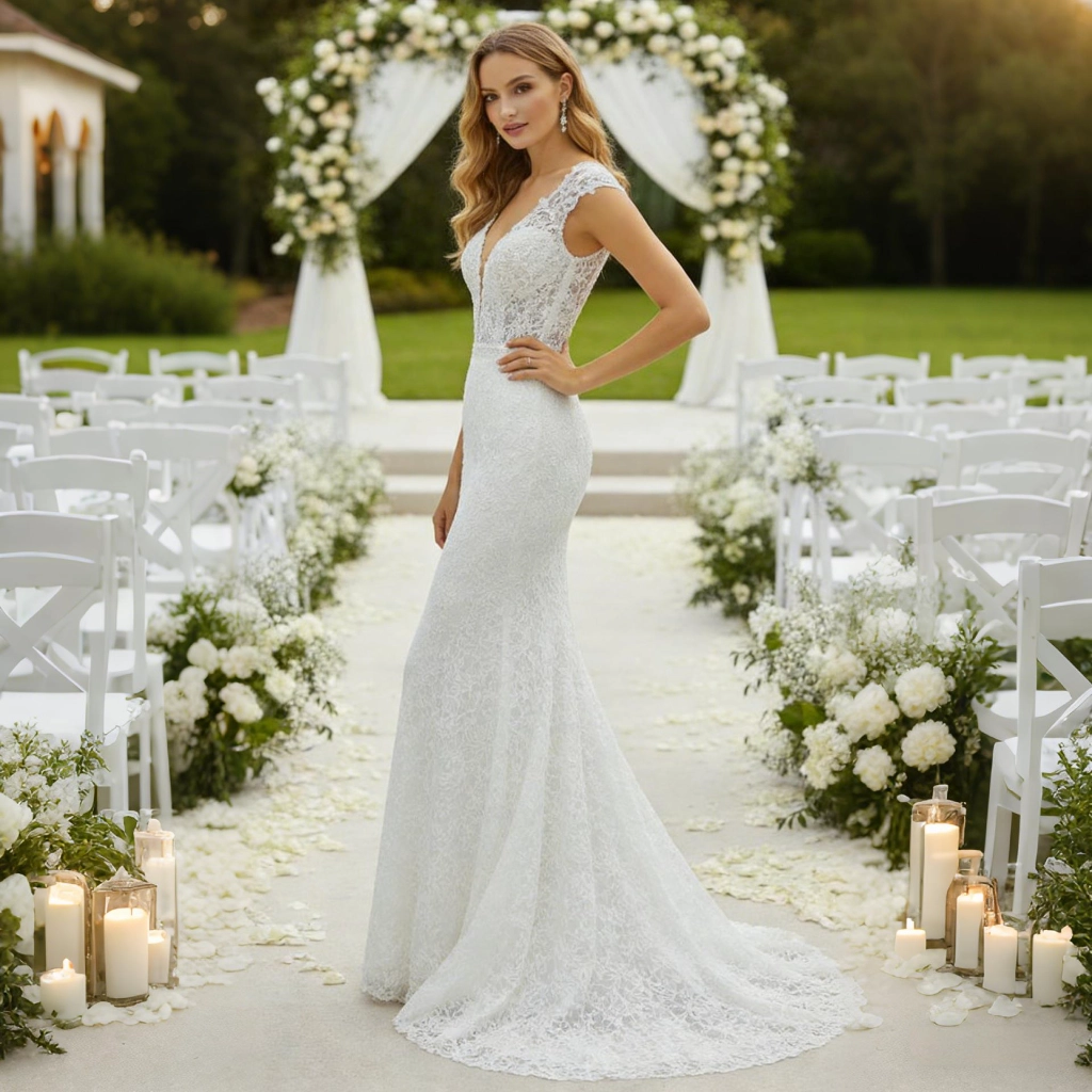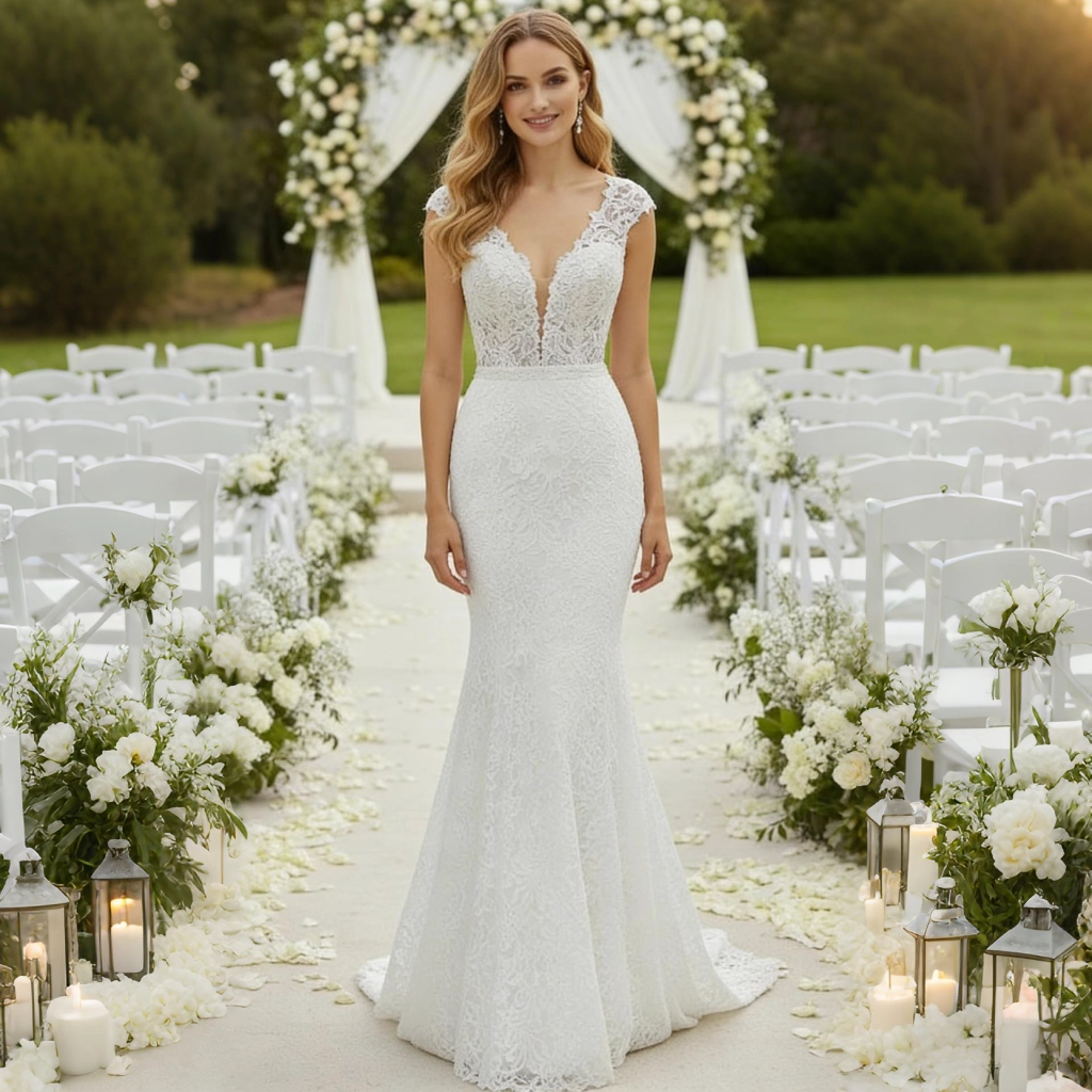 A white sleeveless deep V-neck lace gown, adorned with full-length embroidery and a fishtail train, exudes both opulence and delicacy. It stands as the romantic centerpiece of outdoor ceremonies, radiating an innate sense of nobility.