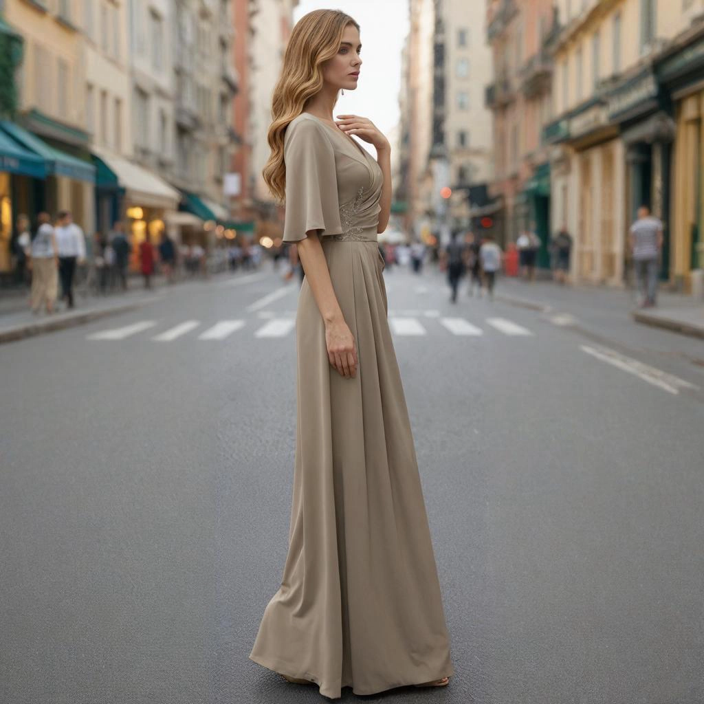 | Description | Khaki V-neck gown with pleated detailing and crystal embellishments. The full skirt silhouette exudes elegance and sophistication, making it an ideal choice for weddings and celebrations to showcase your poise. | A white-based gown with blue floral accents, featuring a fitted silhouette and belted waist. The intricate print exudes elegance, making it an ideal choice for banquets and celebrations to showcase distinctive taste. | Black nude-paneled dress with sequined top and fishtail skirt. The three-quarter sleeves add a stylish, eye-catching touch, making it the perfect choice to stand out at weddings and celebrations. | A blue-and-white color-blocked sleeveless gown, featuring intricate three-dimensional lace floral embellishments that catch the eye. Its figure-flattering silhouette accentuates elegance, making it a stylish choice to showcase your taste at banquets and celebrations. | A nude pink off-the-shoulder gown, adorned with full-length beaded embroidery for a luxurious and grand look, features three-quarter sleeves that add elegance. It is the perfect eye-catching piece to showcase sophistication at important occasions. | Black and nude color-blocked gown, featuring three-dimensional floral embellishments and a mermaid-style skirt. The three-quarter sleeves lend an air of elegant sophistication, making it the perfect fashion statement for formal occasions where luxury is the focus. |