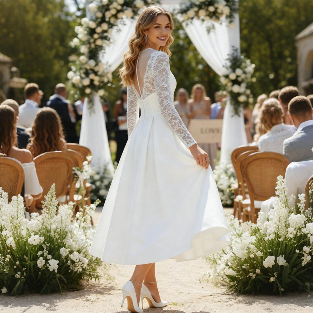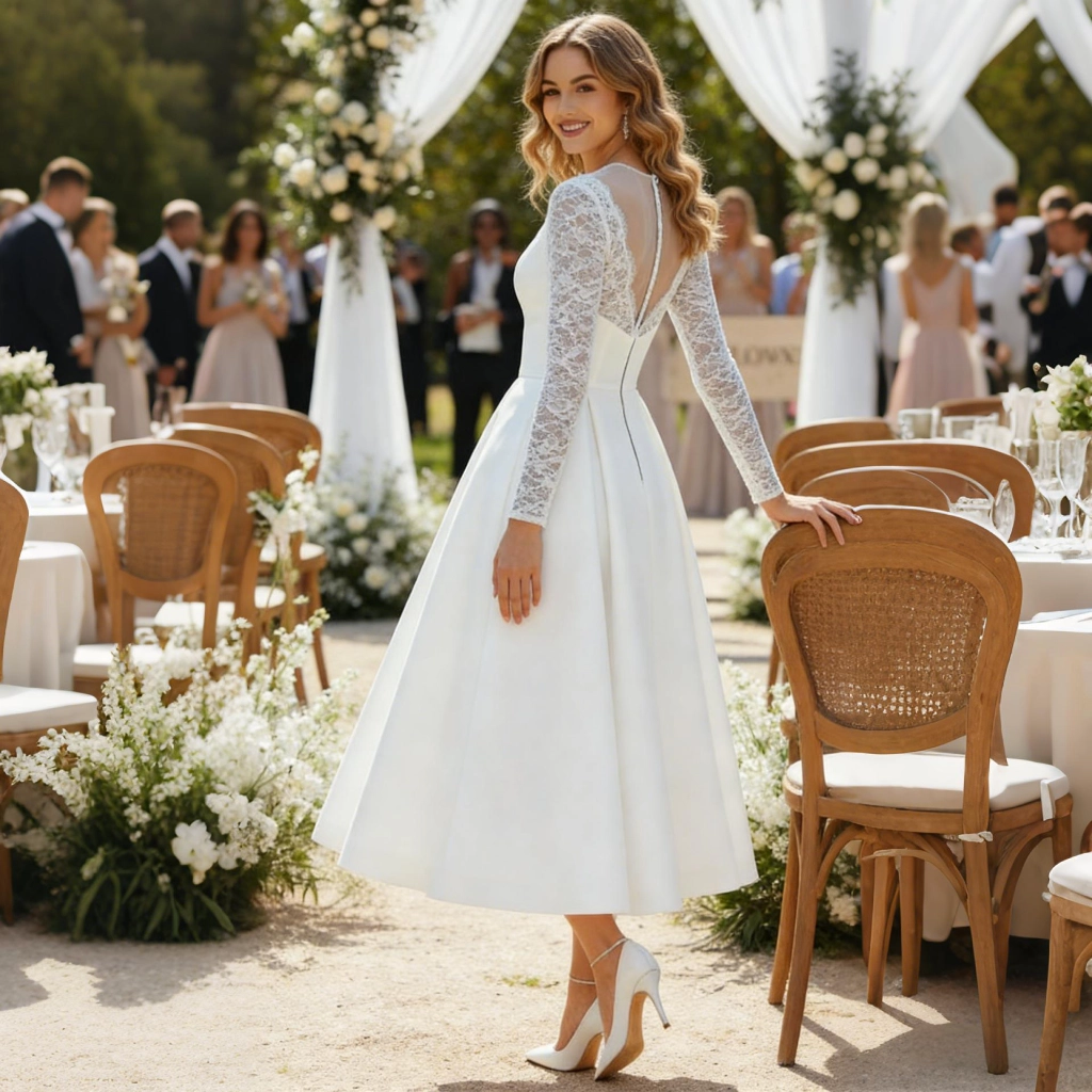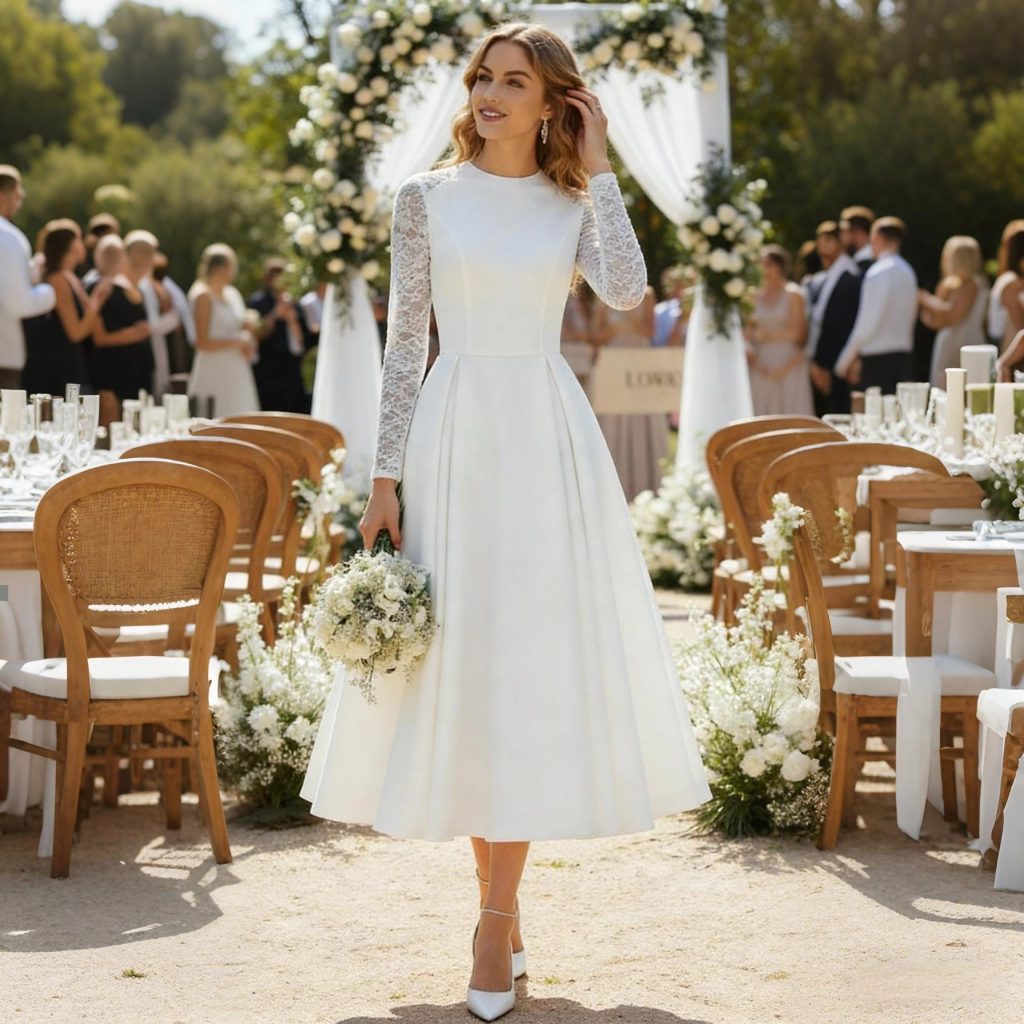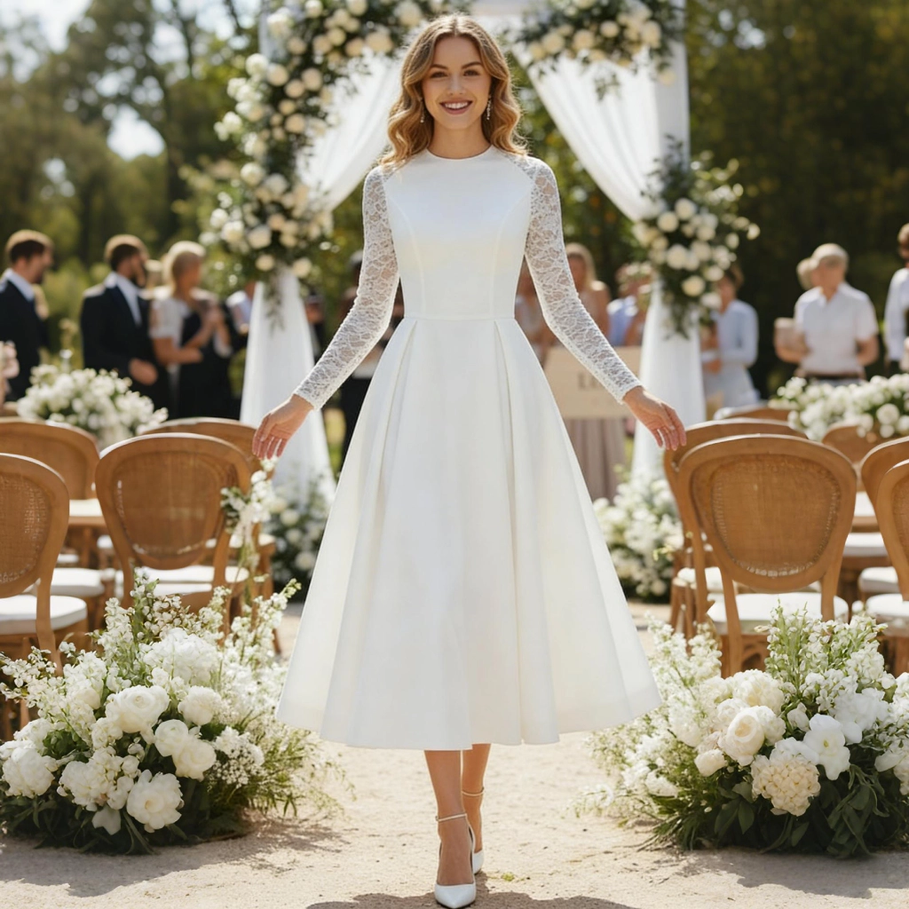A white lace long-sleeve dress with a round neckline, featuring a mid-length A-line silhouette and an openwork back design. Vintage yet graceful, it makes a sweet and playful statement at outdoor garden weddings.