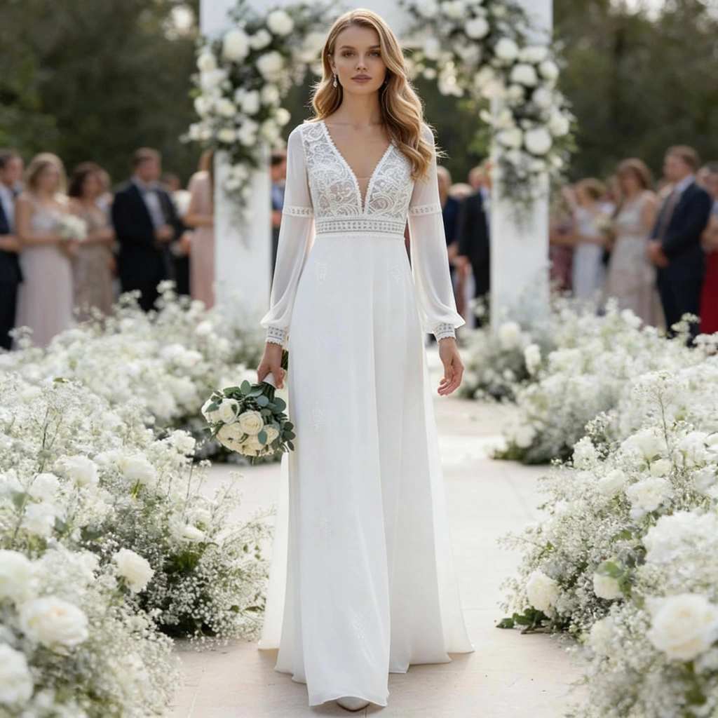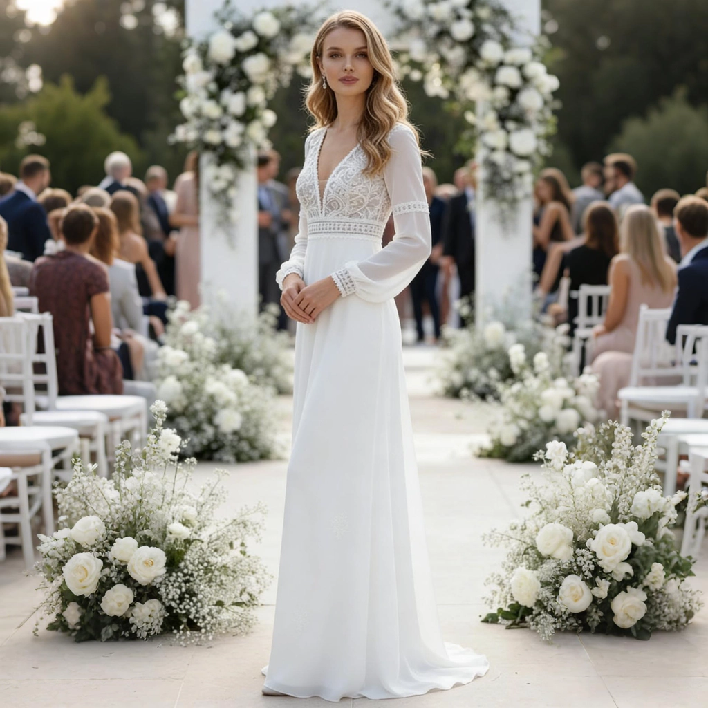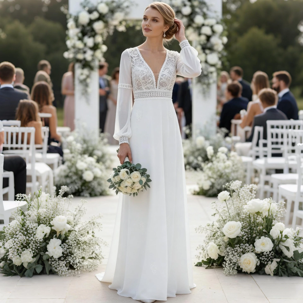 A white deep V-neck lace-paneled gown with sheer long sleeves, flowing skirt, and open back design exudes an ethereal and gentle aura. It’s a graceful choice that naturally elevates the ambiance at an outdoor estate wedding.