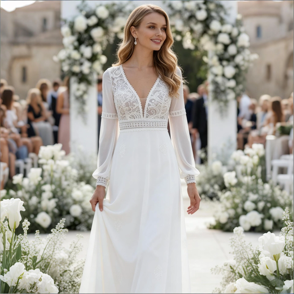 This gown strikes the perfect balance between ethereal charm and refined elegance, radiating romantic allure. Crafted from a blend of chiffon and lace, it features a deep V-neck lace bodice paired with sheer long sleeves. The layered full skirt and open back design add a touch of airy grace. Its dreamy yet gentle aesthetic makes it an ideal choice for outdoor forest weddings or lawn ceremonies. Ethereal and tender, this gown effortlessly captures feminine romance and grace through its lace bodice and chiffon skirt.