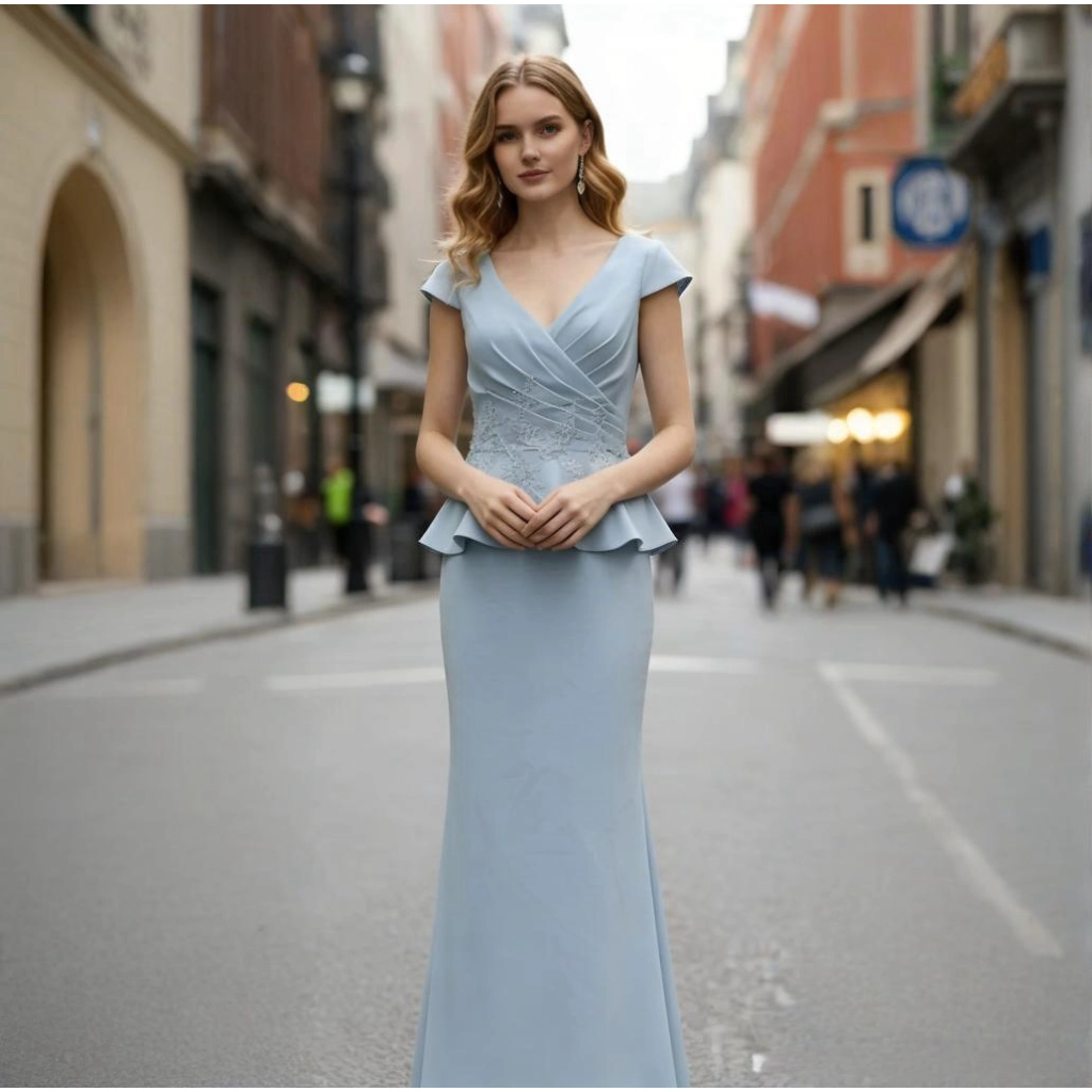| Description | Light blue V-neck gown with ruffled detailing and delicate beadwork, featuring a romantic fishtail hemline—a graceful and captivating choice for weddings. | A blue one-shoulder gown with three-dimensional floral embellishments and flowing tulle sleeves. Its tailored silhouette accentuates elegance, making it a captivating choice for showcasing distinctive taste at evening events. | A light blue one-shoulder gown with long sleeves and a jeweled bow exudes understated elegance, making it an ideal choice for formal occasions to showcase a gentle and refined demeanor. | A purple-gray V-neck gown with bell sleeves and layered pleats, crafted from flowing fabric that exudes romance—the perfect choice for showcasing grace at evening events. | This purple-gray V-neck gown features three-quarter sleeves adorned with three-dimensional floral embellishments and a mermaid-style skirt. Crafted from elegantly draping fabric, it exudes sophistication and grace for formal occasions. | A royal blue feather-adorned gown, featuring layered cuts paired with jeweled embellishments and feather sleeves, boasts a distinctive design that radiates individuality. It's the perfect eye-catching piece to stand out at any party. |