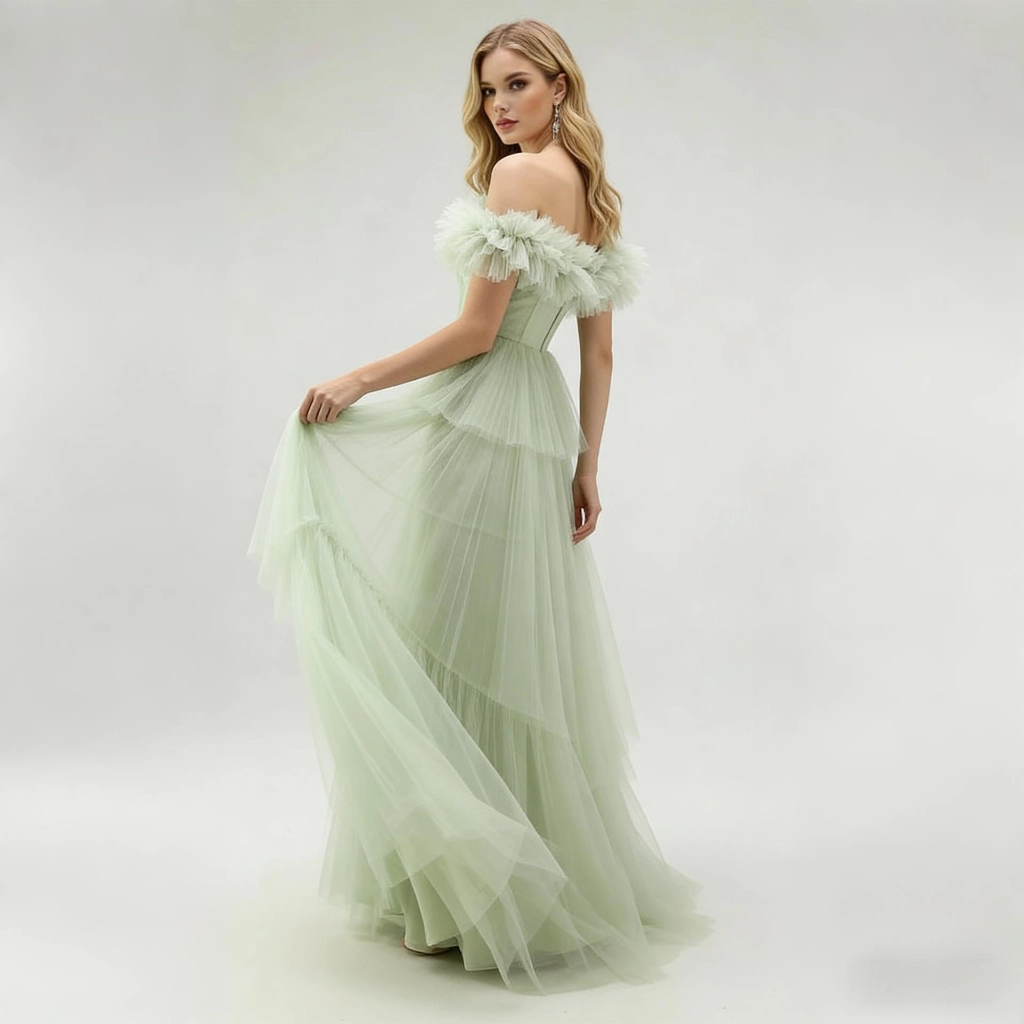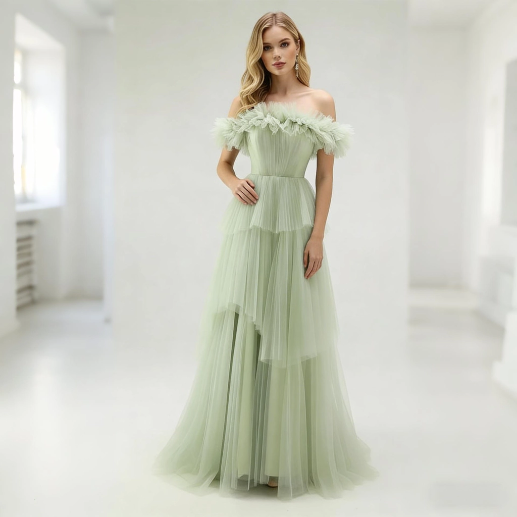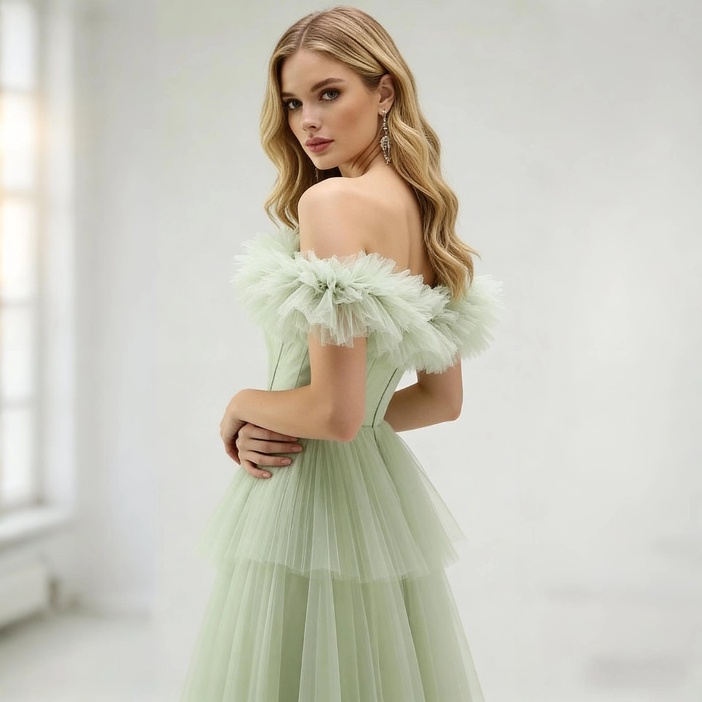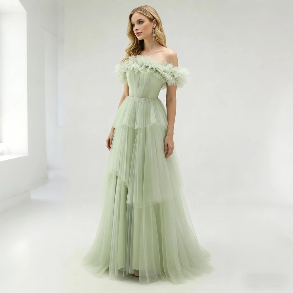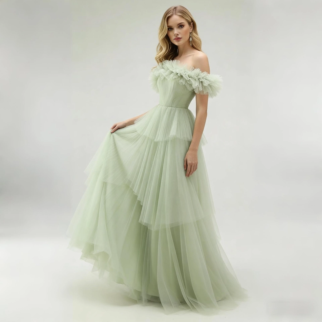 | Description | A mint green off-the-shoulder gown, featuring a multi-layered tulle skirt adorned with feathers, exudes a fresh, romantic, and ethereal charm. It's the perfect fairy-tale choice for a lawn wedding or spring party. | This light blue lace one-shoulder gown features exquisite, elegant long sleeves and an asymmetrical hemline that exudes unique charm. It is a captivating choice for evening events and parties, showcasing feminine grace and individuality.