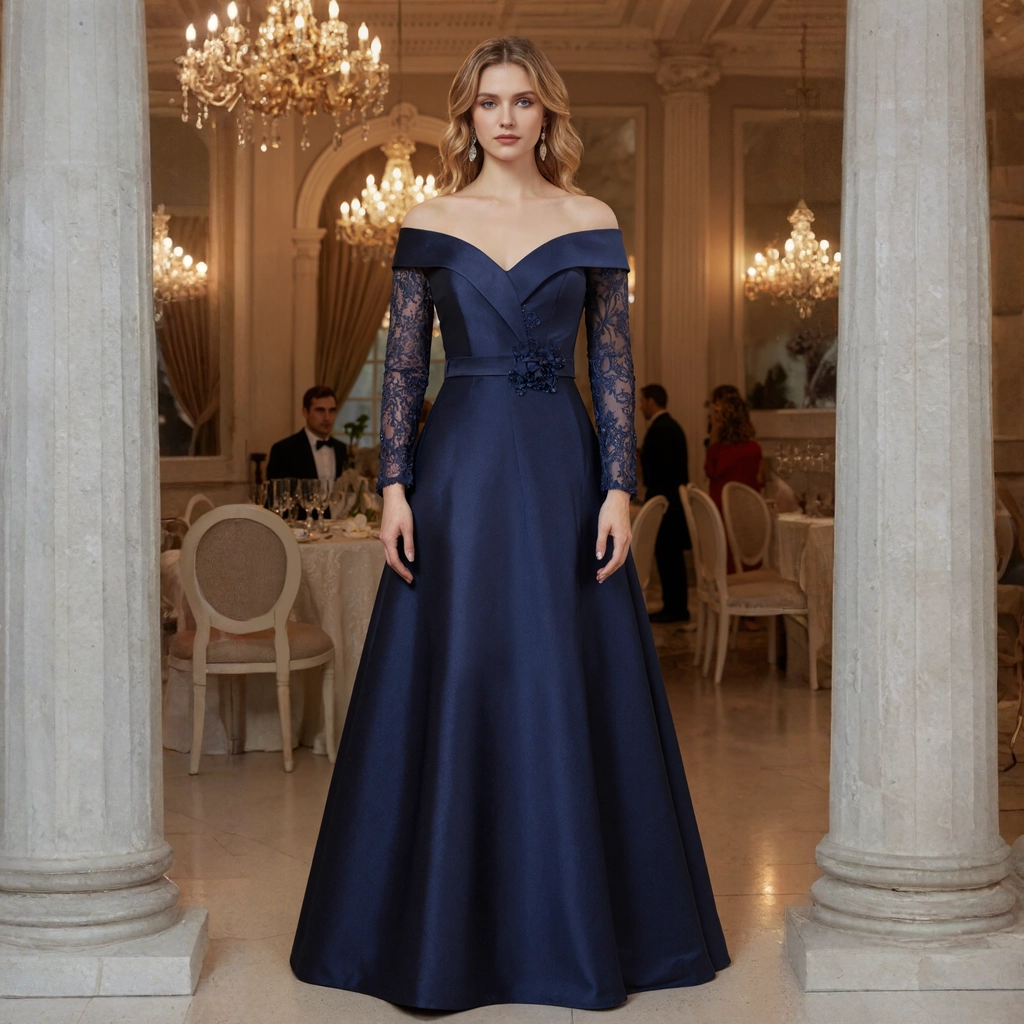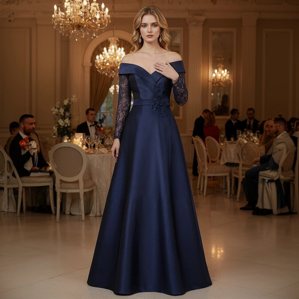 Navy blue lace-sleeve off-the-shoulder ball gown