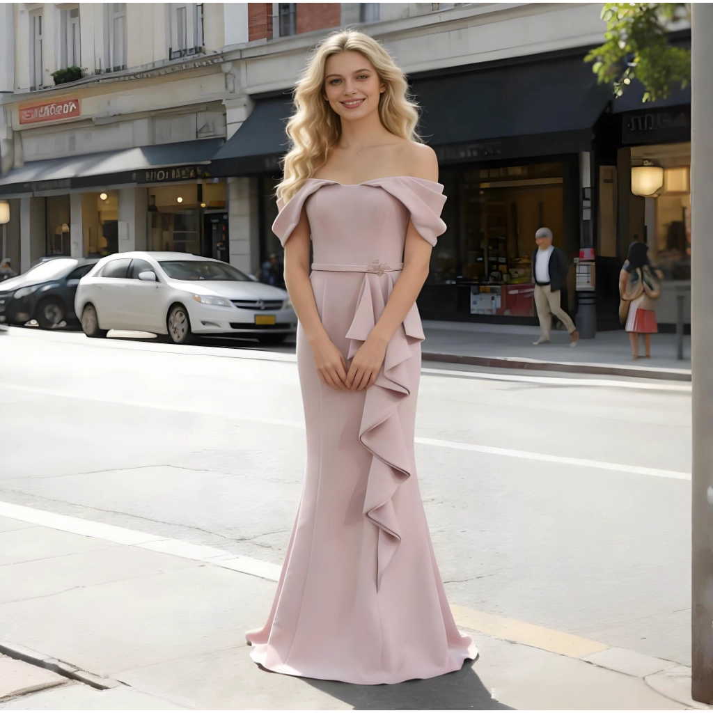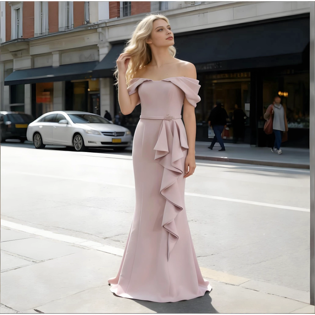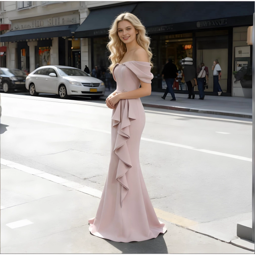 | Description | A nude pink strapless gown with three-dimensional pleats and a mermaid-style skirt. Its minimalist design highlights refined taste, making it an elegant choice for formal occasions. | A royal blue feather-adorned gown, featuring layered cuts paired with jeweled embellishments and feather sleeves, boasts a distinctive design that radiates individuality. It's the perfect eye-catching piece to stand out at any party. | A rose-pink long-sleeved gown, featuring pleated detailing and diamond embellishments, with an elegant and sophisticated fishtail hemline—the perfect choice for weddings and celebrations to showcase opulence. | A blue-and-white V-neck gown with short sleeves and three-dimensional floral embellishments. Its layered skirt flatters the figure, making it an elegant and distinctive choice for banquets and parties. | Navy blue fishtail gown with a square neckline and sculpted pleats. The fitted skirt accentuates curves, making it a stylish choice to showcase elegance at formal events. | A rose-pink square-neck gown with a contrasting waist sash and bell sleeves adorned with pearls. Its tailored silhouette accentuates an elegant demeanor, making it a fashion-forward choice that commands attention at parties and weddings. |