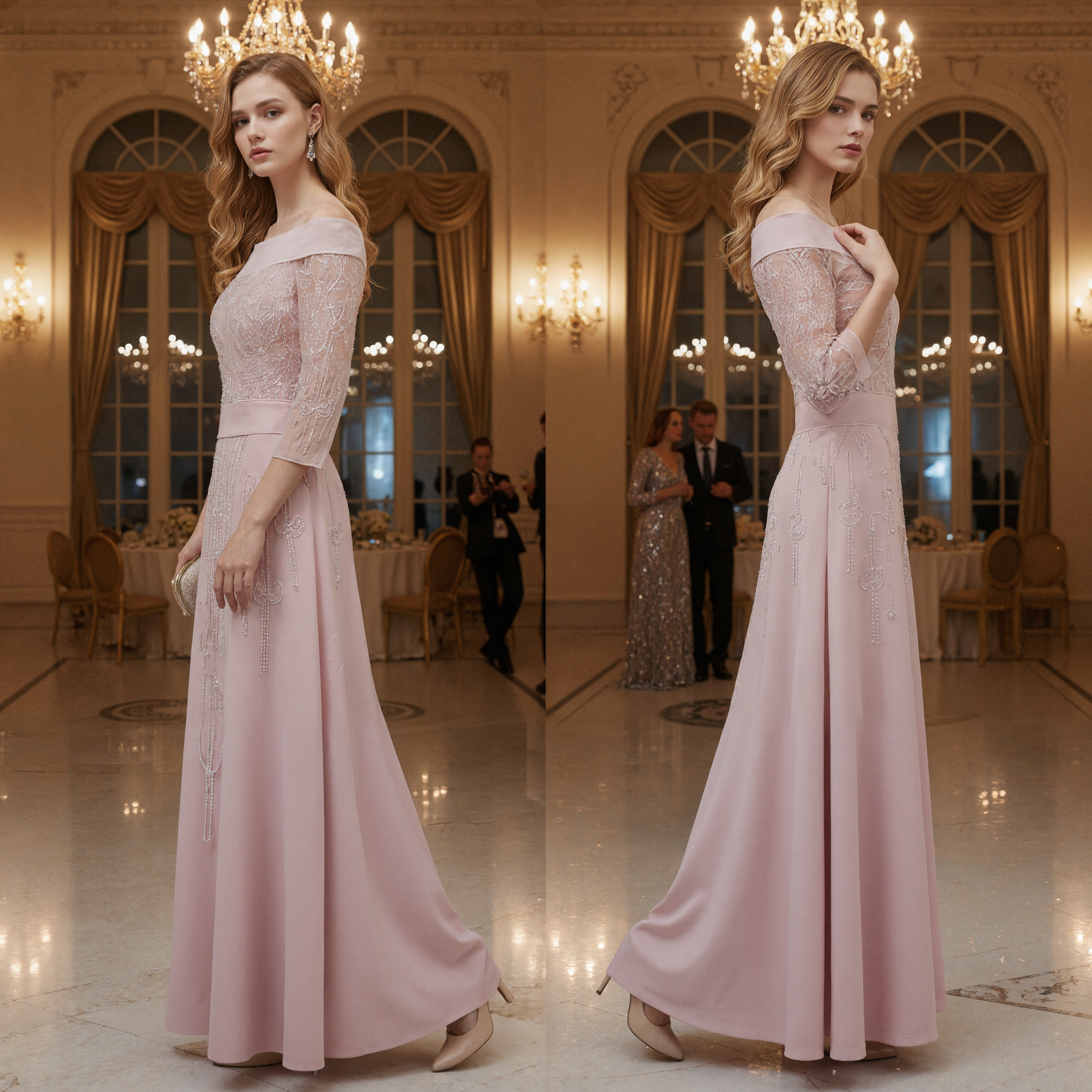 A nude pink off-the-shoulder gown, adorned with full-length beaded embroidery for a luxurious and grand look, features three-quarter sleeves that add elegance. It is the perfect eye-catching piece to showcase sophistication at important occasions.