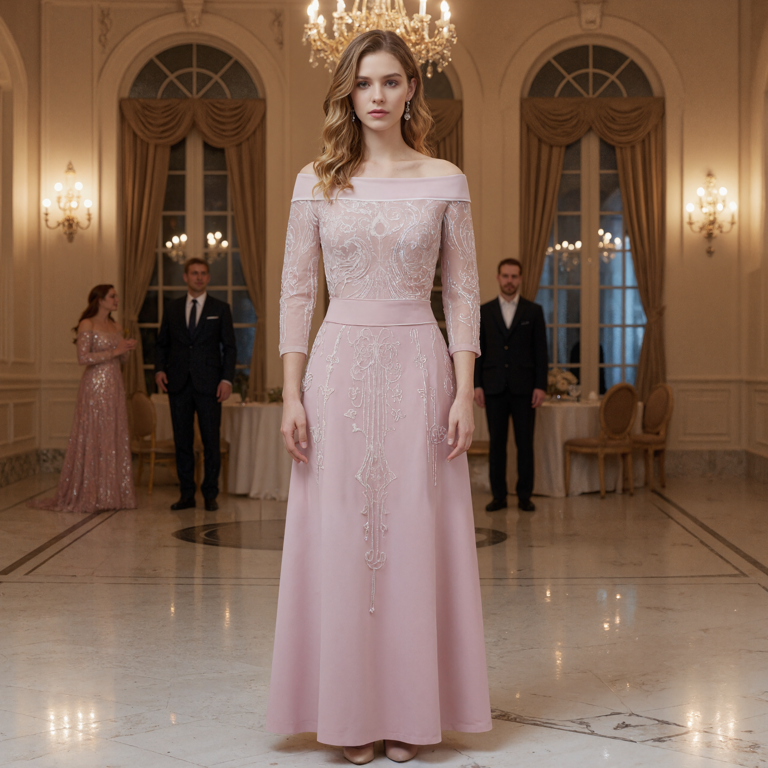 This gown seamlessly blends opulence with romance, radiating a dazzling glow. Crafted in nude pink fabric, it features exquisite sequin embroidery and a seductively alluring off-the-shoulder design. Its overall style is opulent yet romantic, making it an ideal choice for galas, award ceremonies, or significant celebrations. Lavish and romantic, this gown perfectly embodies feminine elegance and charm through its sequin embroidery and graceful silhouette.