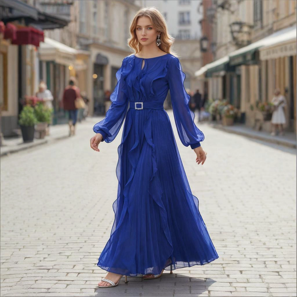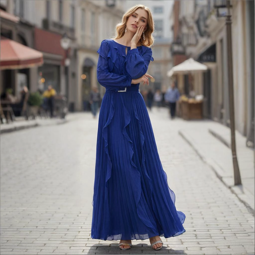 | Description | A sapphire-blue gown with cascading pleats and a jeweled belt, crafted from flowing fabric that exudes grace, is the perfect choice to radiate vitality at parties and formal dinners. | This pink and purple color-blocked dress features a V-neck design with flared sleeves and a romantic, eye-catching three-dimensional floral skirt, making it an excellent choice for showcasing a unique style at weddings and celebrations. | A blue-and-white V-neck gown with short sleeves and three-dimensional floral embellishments. Its layered skirt flatters the figure, making it an elegant and distinctive choice for banquets and parties. | A deep blue layered gown features a square neckline paired with flowing chiffon sleeves. The waist is adorned with jeweled embellishments and sculpted pleats, creating a flattering silhouette that conceals curves while exuding sophistication. This elegant ensemble is the perfect choice for formal occasions. | A nude pink gown with a tulle shawl and tailored silhouette—its unique design radiates romance, making it the perfect eye-catching piece to transform you into an ethereal fairy at the gala. | A royal blue feather-adorned gown, featuring layered cuts paired with jeweled embellishments and feather sleeves, boasts a distinctive design that radiates individuality. It's the perfect eye-catching piece to stand out at any party. |