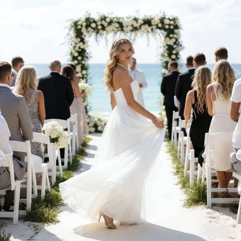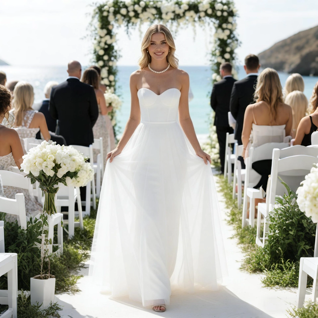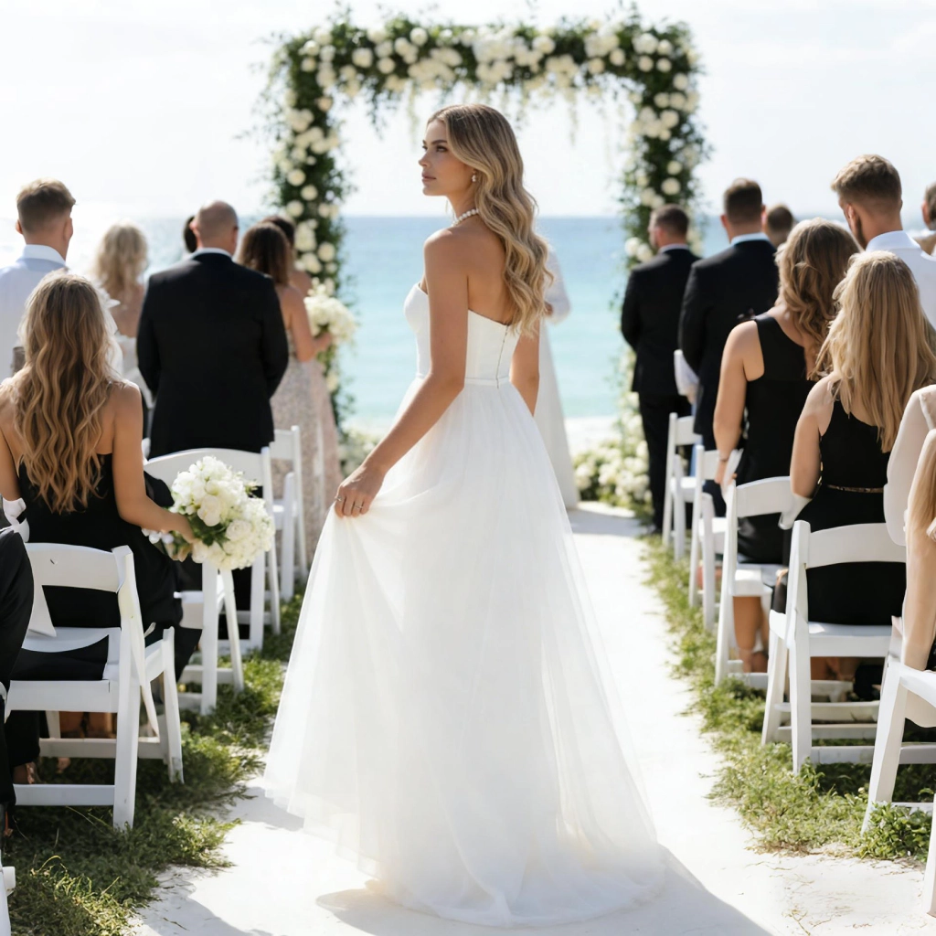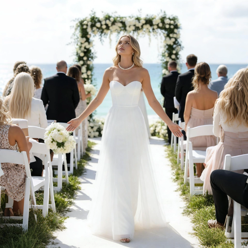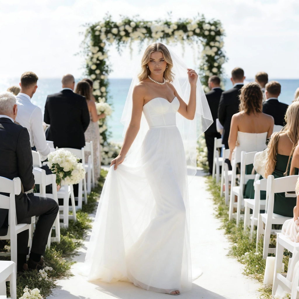 | Description | A white strapless sweetheart neckline gown, featuring minimalist satin paired with a lightweight A-line tulle skirt, strikes a balance between sharp sophistication and soft elegance. It serves as the understated yet refined focal point for a seaside walkway ceremony. | Navy blue fishtail gown with a square neckline and sculpted pleats. The fitted skirt accentuates curves, making it a stylish choice to showcase elegance at formal events. | A nude pink lace gown with three-quarter sleeves, adorned with three-dimensional floral appliqués and a large bow. Its layered skirt exudes romantic elegance, making it the perfect choice for weddings and formal dinners to showcase feminine grace. | A royal blue feather-adorned gown, featuring layered cuts paired with jeweled embellishments and feather sleeves, boasts a distinctive design that radiates individuality. It's the perfect eye-catching piece to stand out at any party. | This pink and purple color-blocked dress features a V-neck design with flared sleeves and a romantic, eye-catching three-dimensional floral skirt, making it an excellent choice for showcasing a unique style at weddings and celebrations. | Black and nude color-blocked gown, featuring three-dimensional floral embellishments and a mermaid-style skirt. The three-quarter sleeves lend an air of elegant sophistication, making it the perfect fashion statement for formal occasions where luxury is the focus. |