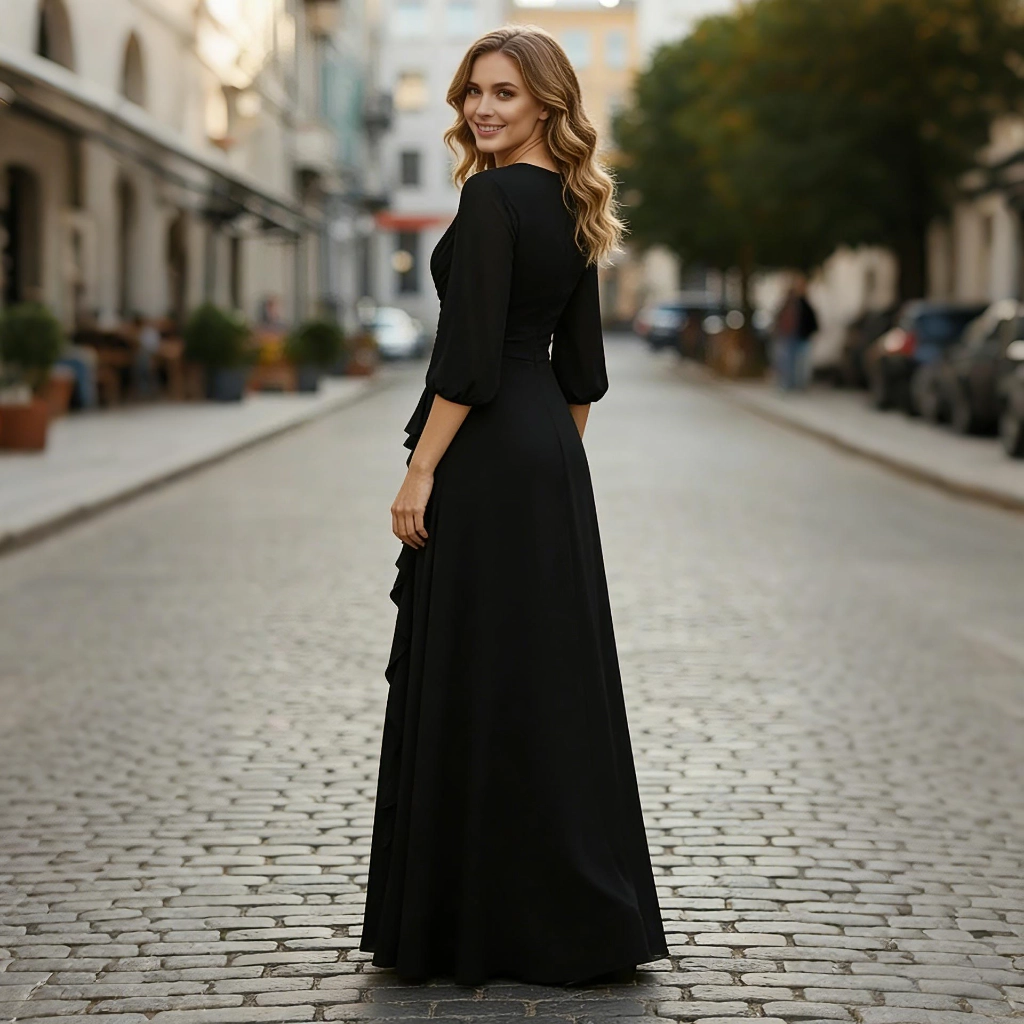 Black V-neck gown with ruffled detailing and flowing fabric—simple yet elegant, it’s the stylish choice to command attention at any celebration.