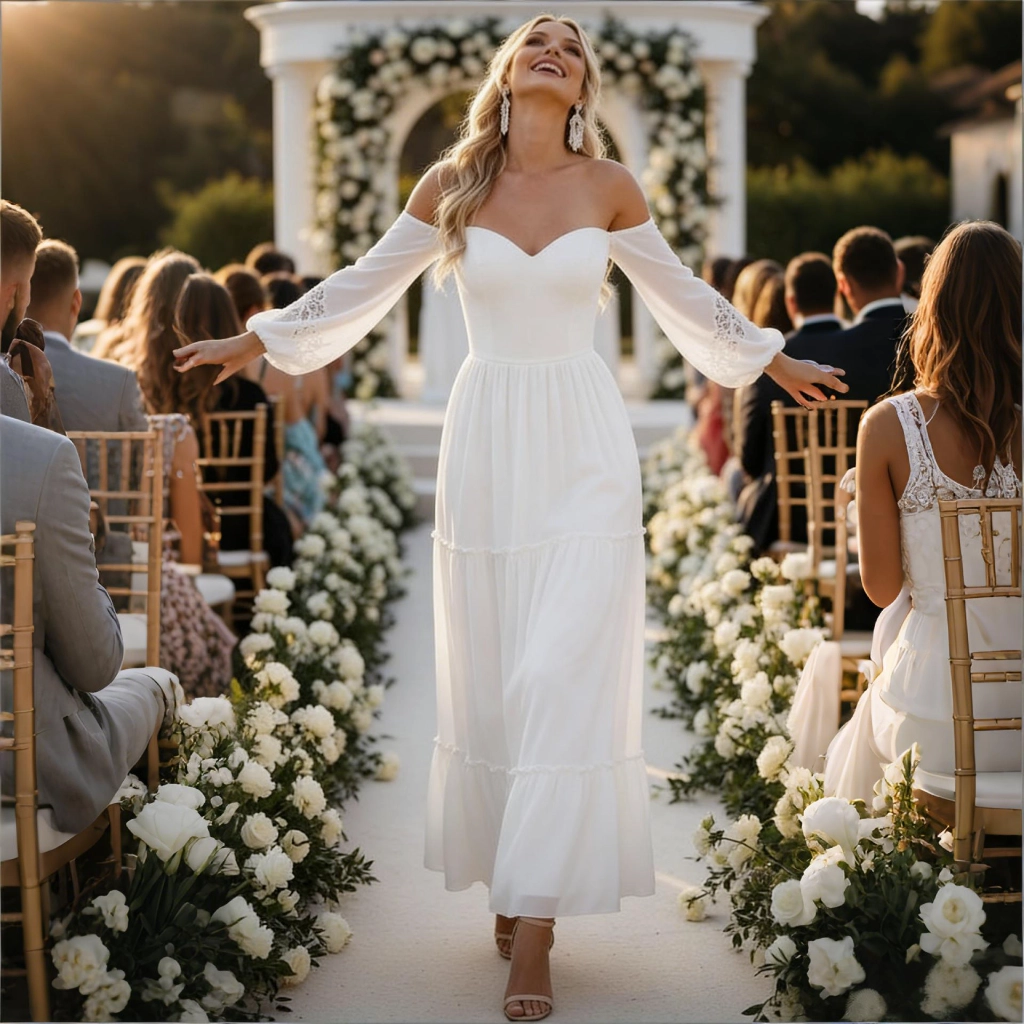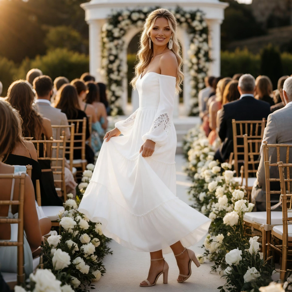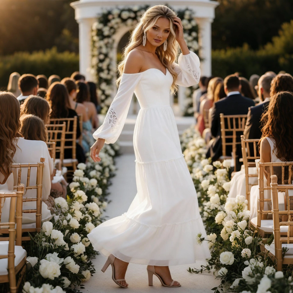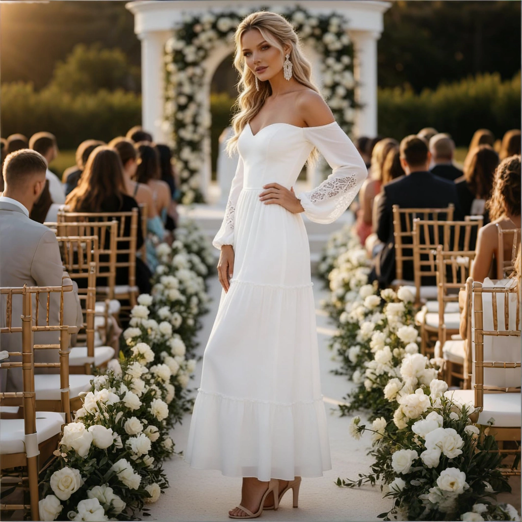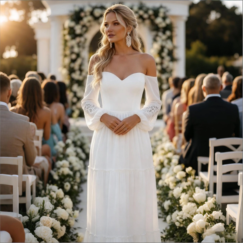 | Description | A white off-the-shoulder sweetheart neckline gown, featuring a cascading layered skirt and lace cuffs, exudes lightness and tenderness. This elegant choice naturally radiates romantic charm, making it perfect for a garden wedding. | A nude pink lace gown with three-quarter sleeves, adorned with three-dimensional floral appliqués and a large bow. Its layered skirt exudes romantic elegance, making it the perfect choice for weddings and formal dinners to showcase feminine grace. | A blue-and-white color-blocked sleeveless gown, featuring intricate three-dimensional lace floral embellishments that catch the eye. Its figure-flattering silhouette accentuates elegance, making it a stylish choice to showcase your taste at banquets and celebrations. | A nude pink off-the-shoulder gown, adorned with full-length beaded embroidery for a luxurious and grand look, features three-quarter sleeves that add elegance. It is the perfect eye-catching piece to showcase sophistication at important occasions. | A nude pink gown with a tulle shawl and tailored silhouette—its unique design radiates romance, making it the perfect eye-catching piece to transform you into an ethereal fairy at the gala. | This pink and purple color-blocked dress features a V-neck design with flared sleeves and a romantic, eye-catching three-dimensional floral skirt, making it an excellent choice for showcasing a unique style at weddings and celebrations. |