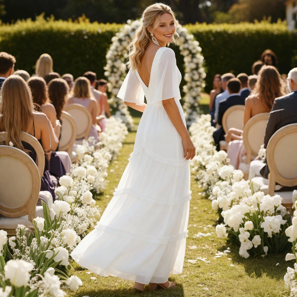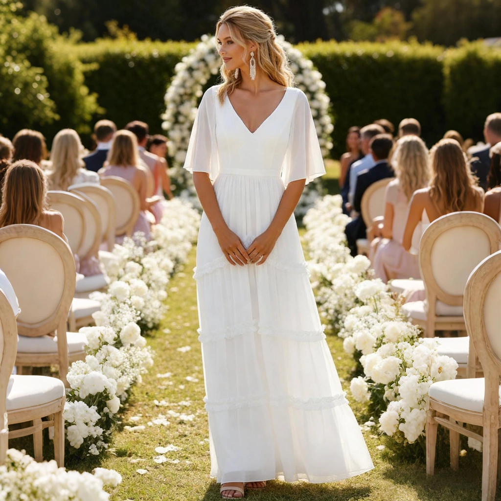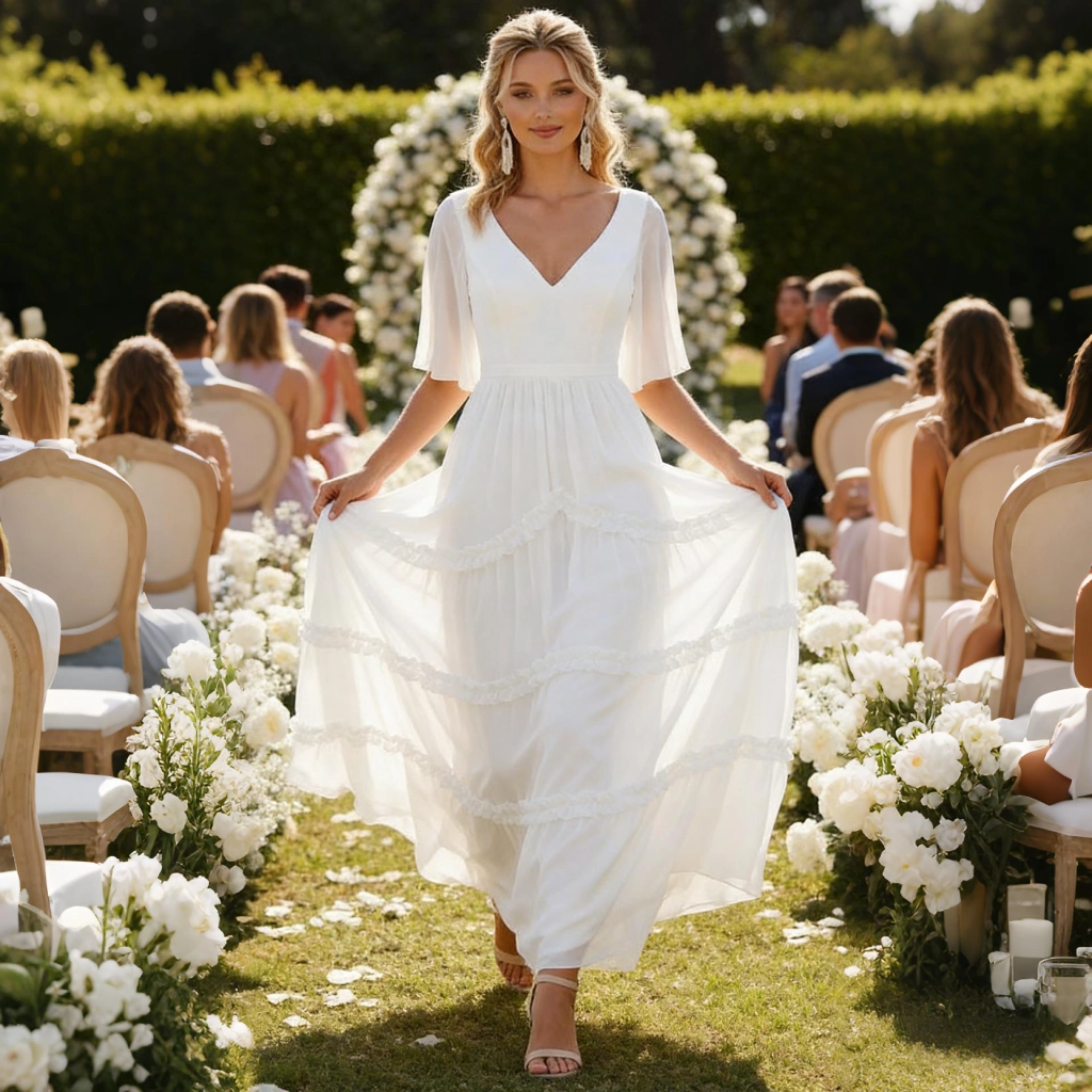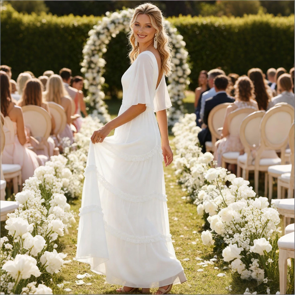 | Description | White V-neck layered maxi dress with bell sleeves and an open back design—fresh and romantic, it's an elegant and sweet eye-catcher for lawn weddings. | This purple-gray V-neck gown features three-quarter sleeves adorned with three-dimensional floral embellishments and a mermaid-style skirt. Crafted from elegantly draping fabric, it exudes sophistication and grace for formal occasions. | A blue-and-white printed gown with bell sleeves and a cinched waist, featuring a vintage print that is both refined and elegant. It is a distinctive choice for banquets and parties, allowing you to showcase your individuality. | Black and nude color-blocked gown, featuring three-dimensional floral embellishments and a mermaid-style skirt. The three-quarter sleeves lend an air of elegant sophistication, making it the perfect fashion statement for formal occasions where luxury is the focus. | A blue one-shoulder gown with three-dimensional floral embellishments and flowing tulle sleeves. Its tailored silhouette accentuates elegance, making it a captivating choice for showcasing distinctive taste at evening events. | A royal blue feather-adorned gown, featuring layered cuts paired with jeweled embellishments and feather sleeves, boasts a distinctive design that radiates individuality. It's the perfect eye-catching piece to stand out at any party. |