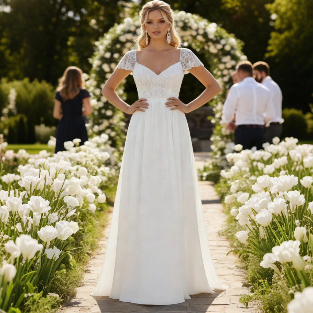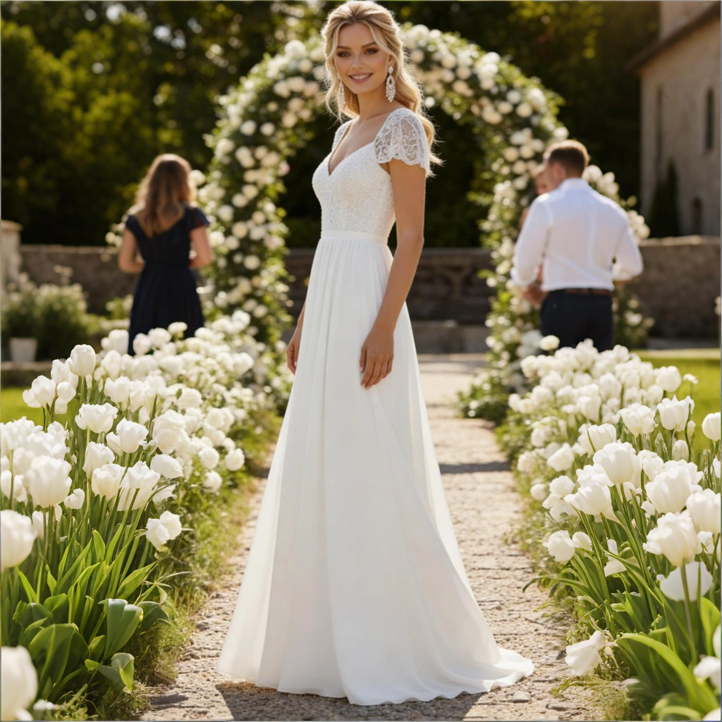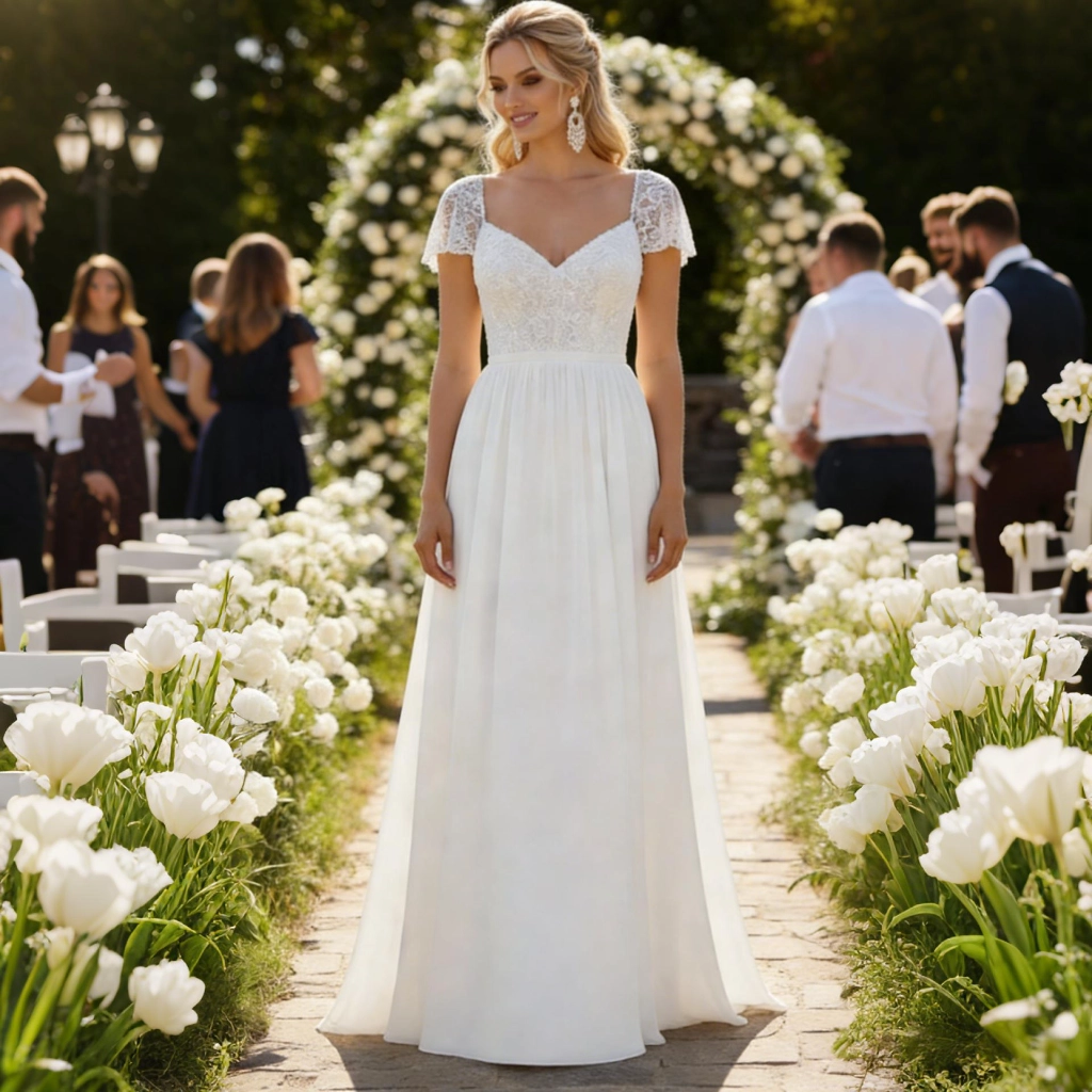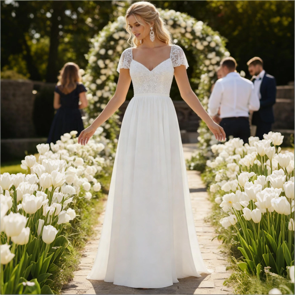 This gown seamlessly blends romance with freshness, radiating a gentle elegance. Crafted from white lace and sheer tulle, it features a sweetheart neckline with short sleeves and a flowing skirt silhouette. Delicate lace embellishments add sophistication, while the lightweight skirt creates a graceful, airy movement. Its overall romantic yet fresh style makes it an ideal choice for outdoor weddings, garden parties, or spring ceremonies. Romantic and fresh, this gown precisely captures feminine grace and vitality through its lace elements and sweetheart neckline.