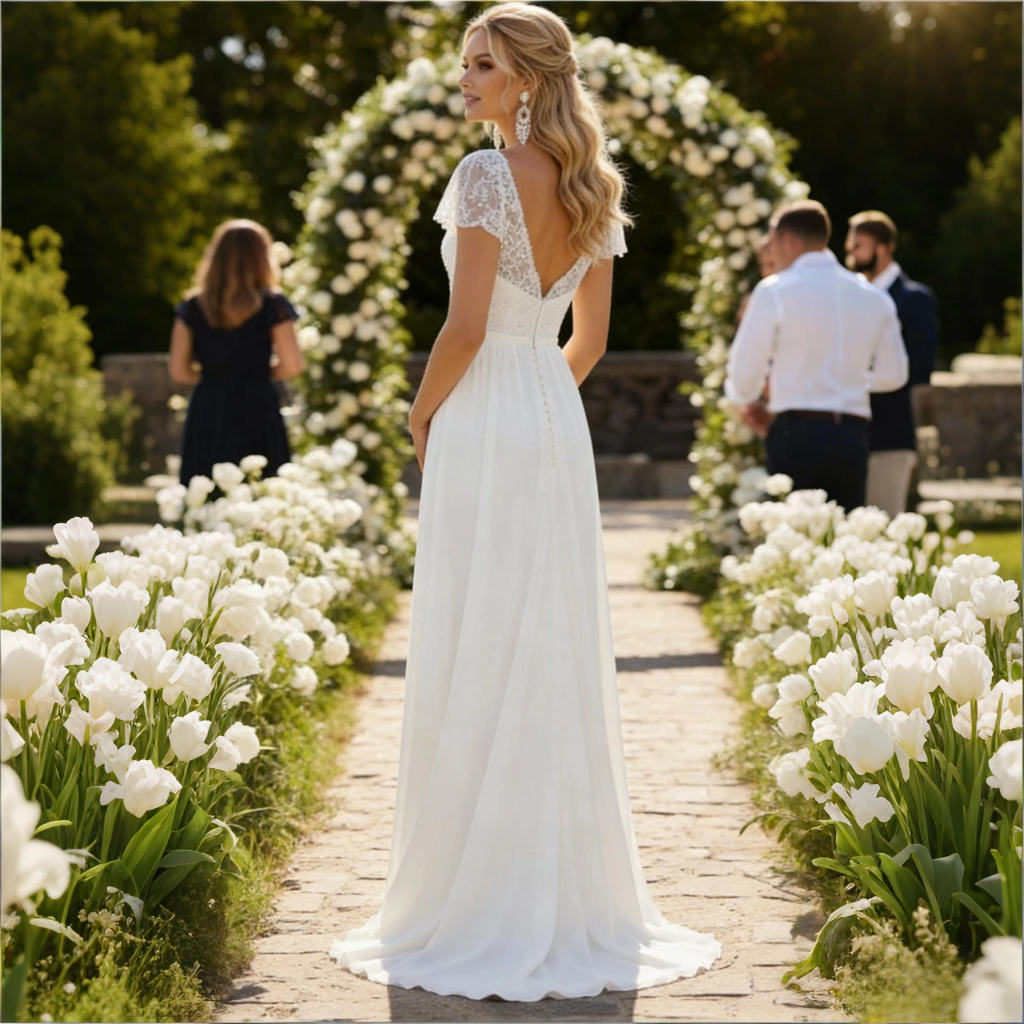 A white lace short-sleeved gown with a deep V-neckline, featuring a cinched waist and a light, flowing skirt. Fresh and refined, it embodies graceful charm and captivating allure at the Floral Path ceremony.