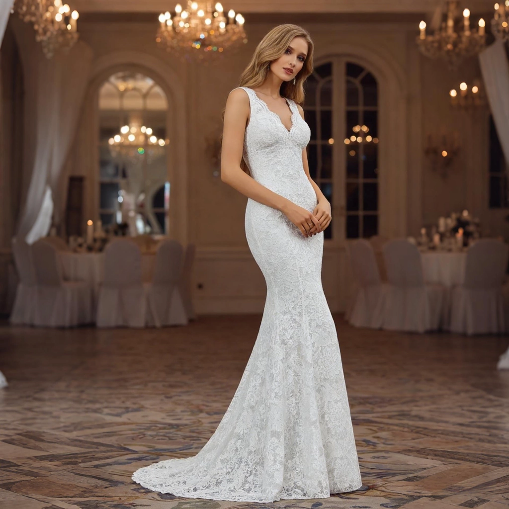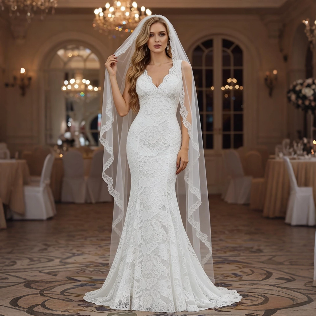 | Description | A white lace deep V-neck mermaid gown with an open back and trailing train—delicate and refined, it is the ethereal and elegant star of the wedding. | Black and nude color-blocked gown, featuring three-dimensional floral embellishments and a mermaid-style skirt. The three-quarter sleeves lend an air of elegant sophistication, making it the perfect fashion statement for formal occasions where luxury is the focus. | Navy blue one-shoulder gown with lace sleeves adorned with three-dimensional floral appliqués. The full skirt silhouette exudes elegance and grandeur, while exquisite details showcase your luxurious taste at the gala. | A blue one-shoulder gown with three-dimensional floral embellishments and flowing tulle sleeves. Its tailored silhouette accentuates elegance, making it a captivating choice for showcasing distinctive taste at evening events. | A nude pink gown with a tulle shawl and tailored silhouette—its unique design radiates romance, making it the perfect eye-catching piece to transform you into an ethereal fairy at the gala. | Navy blue fishtail gown with a square neckline and sculpted pleats. The fitted skirt accentuates curves, making it a stylish choice to showcase elegance at formal events. |