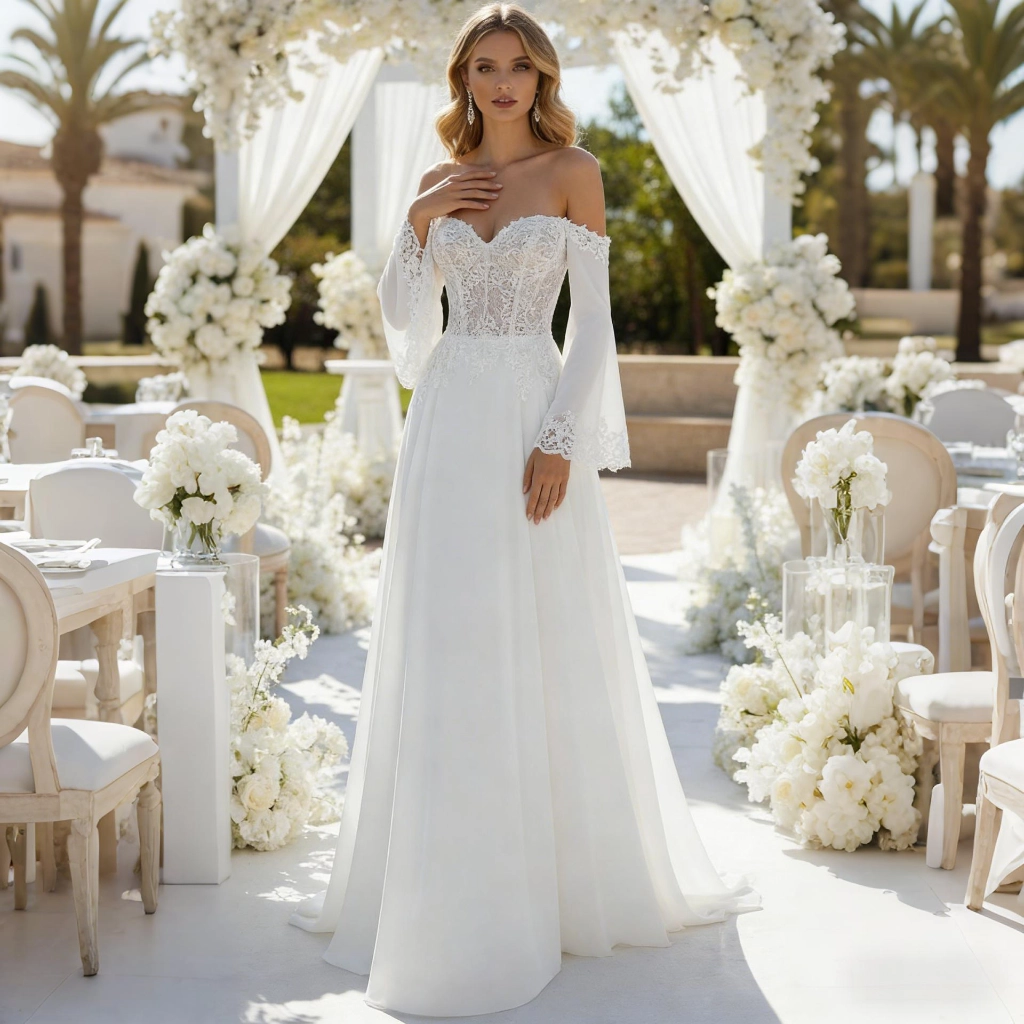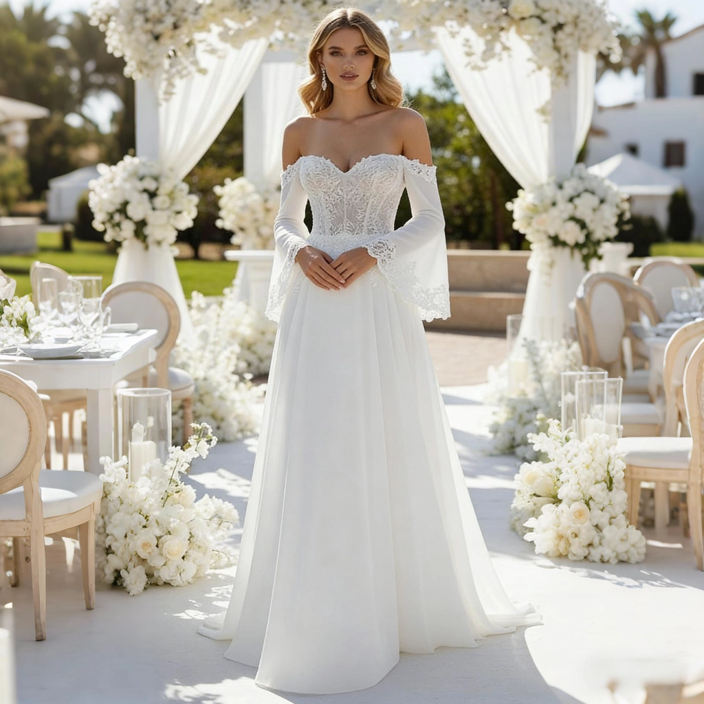 A white lace off-the-shoulder bell-sleeve gown with a cinched waist and lace train exudes romantic softness, making it the sweet, eye-catching centerpiece for outdoor weddings.