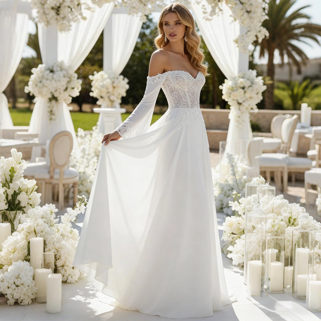 This gown masterfully balances romance and grace, radiating an ethereal aura. Crafted from white tulle and lace panels, it features off-the-shoulder bell sleeves paired with a flowing skirt silhouette. Lace accents add romantic charm, while the lightweight skirt sways gently with every movement. Its overall style is romantic yet refreshingly crisp, making it an ideal choice for outdoor weddings, beach ceremonies, or garden parties. Romantic and fresh, this gown perfectly showcases feminine grace and ethereal charm through its lace details and off-the-shoulder design.
