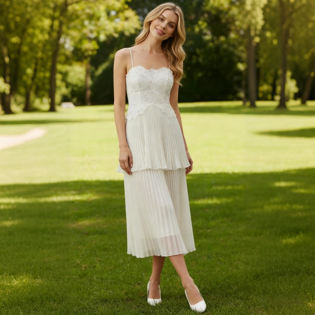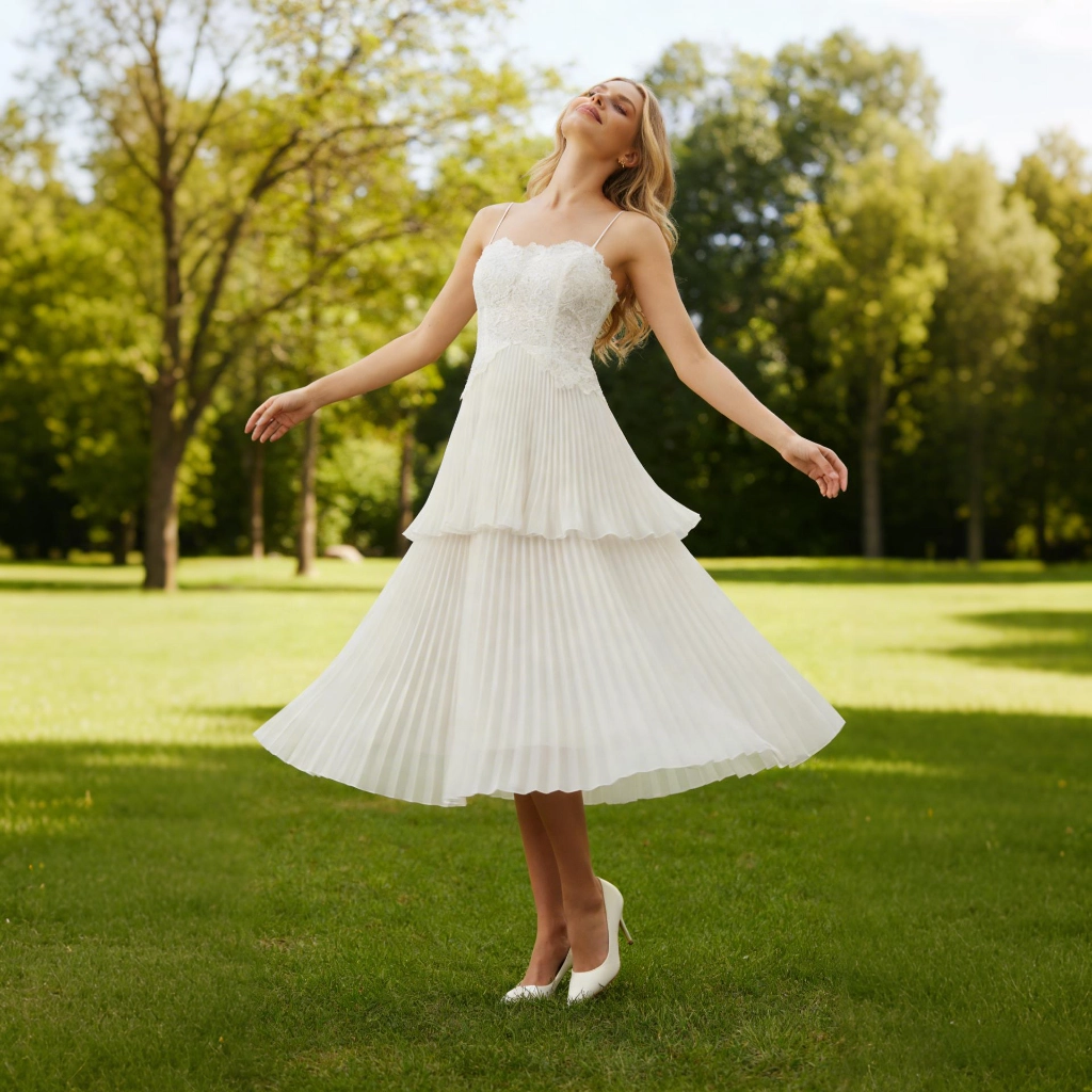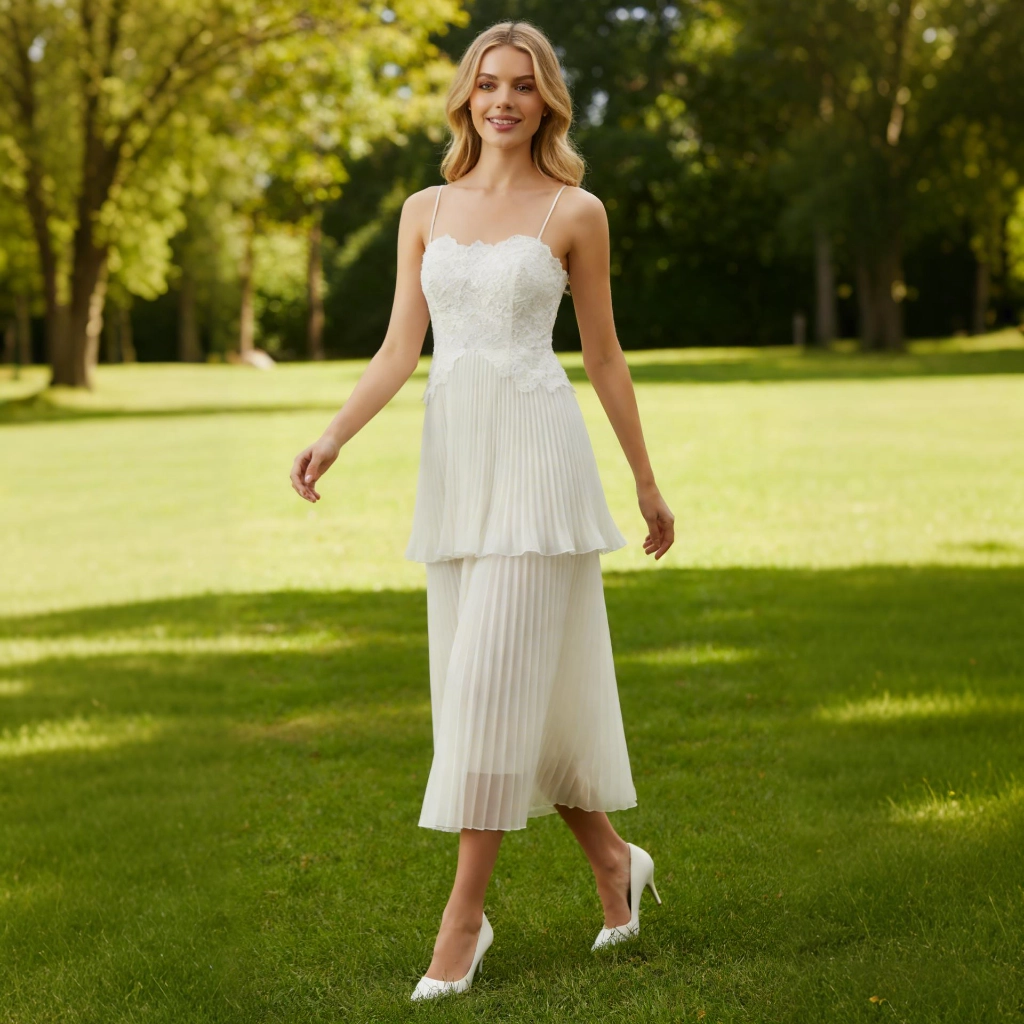 | Description | White lace halter-neck pleated midi skirt with double-layered hem and delicate lace—sweet and vibrant, it's the perfect fresh and eye-catching choice for outdoor tea breaks. | A white-based gown with blue floral accents, featuring a fitted silhouette and belted waist. The intricate print exudes elegance, making it an ideal choice for banquets and celebrations to showcase distinctive taste. | A nude pink gown with a tulle shawl and tailored silhouette—its unique design radiates romance, making it the perfect eye-catching piece to transform you into an ethereal fairy at the gala. | A rose-pink long-sleeved gown, featuring pleated detailing and diamond embellishments, with an elegant and sophisticated fishtail hemline—the perfect choice for weddings and celebrations to showcase opulence. | Black and nude color-blocked gown, featuring three-dimensional floral embellishments and a mermaid-style skirt. The three-quarter sleeves lend an air of elegant sophistication, making it the perfect fashion statement for formal occasions where luxury is the focus. | Navy blue fishtail gown with a square neckline and sculpted pleats. The fitted skirt accentuates curves, making it a stylish choice to showcase elegance at formal events. |