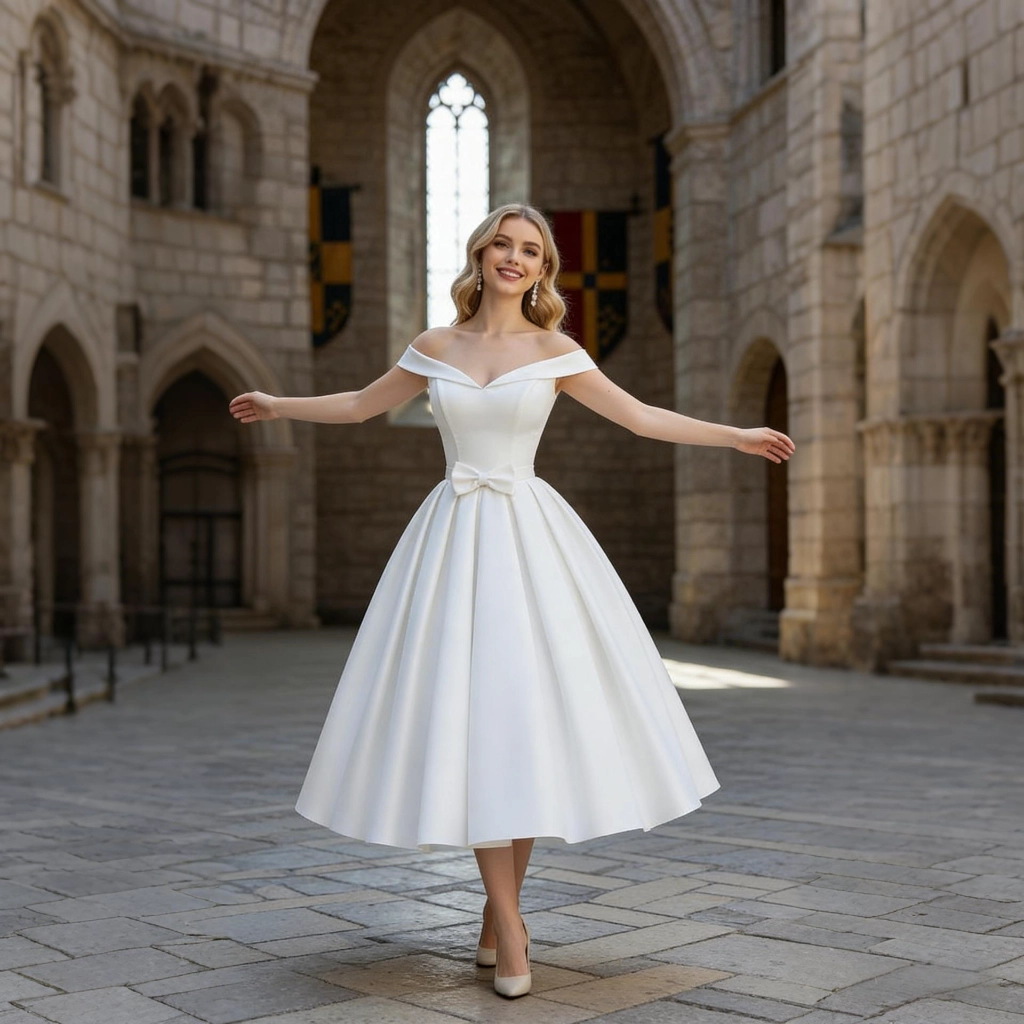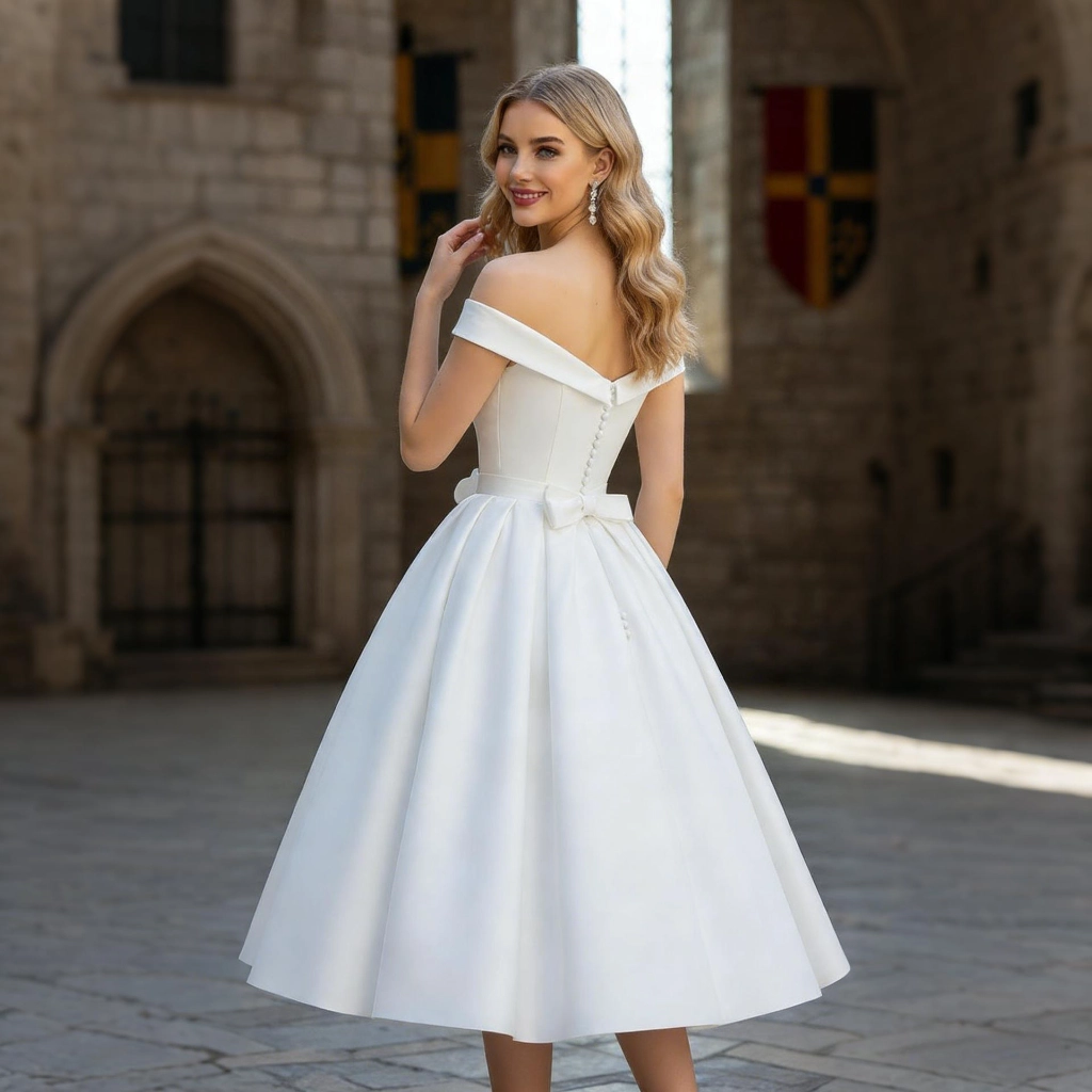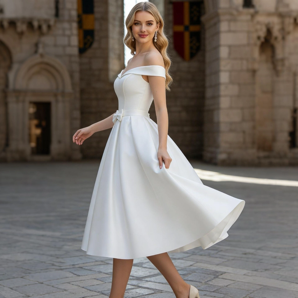 | Description | A white satin off-the-shoulder mini dress with a cinched waist, full skirt, and button detailing at the back. Delicate and playful, it makes for a fresh and sweet focal point at intimate ceremonies. | A blue one-shoulder gown with three-dimensional floral embellishments and flowing tulle sleeves. Its tailored silhouette accentuates elegance, making it a captivating choice for showcasing distinctive taste at evening events. | A royal blue feather-adorned gown, featuring layered cuts paired with jeweled embellishments and feather sleeves, boasts a distinctive design that radiates individuality. It's the perfect eye-catching piece to stand out at any party. | A nude pink lace gown with three-quarter sleeves, adorned with three-dimensional floral appliqués and a large bow. Its layered skirt exudes romantic elegance, making it the perfect choice for weddings and formal dinners to showcase feminine grace. | Navy blue one-shoulder evening gown with lace sleeves and pleated detailing. The elegant fishtail hem exudes sophistication, while exquisite craftsmanship ensures you radiate luxurious taste at banquets and weddings. | A rose-pink long-sleeved gown, featuring pleated detailing and diamond embellishments, with an elegant and sophisticated fishtail hemline—the perfect choice for weddings and celebrations to showcase opulence. |