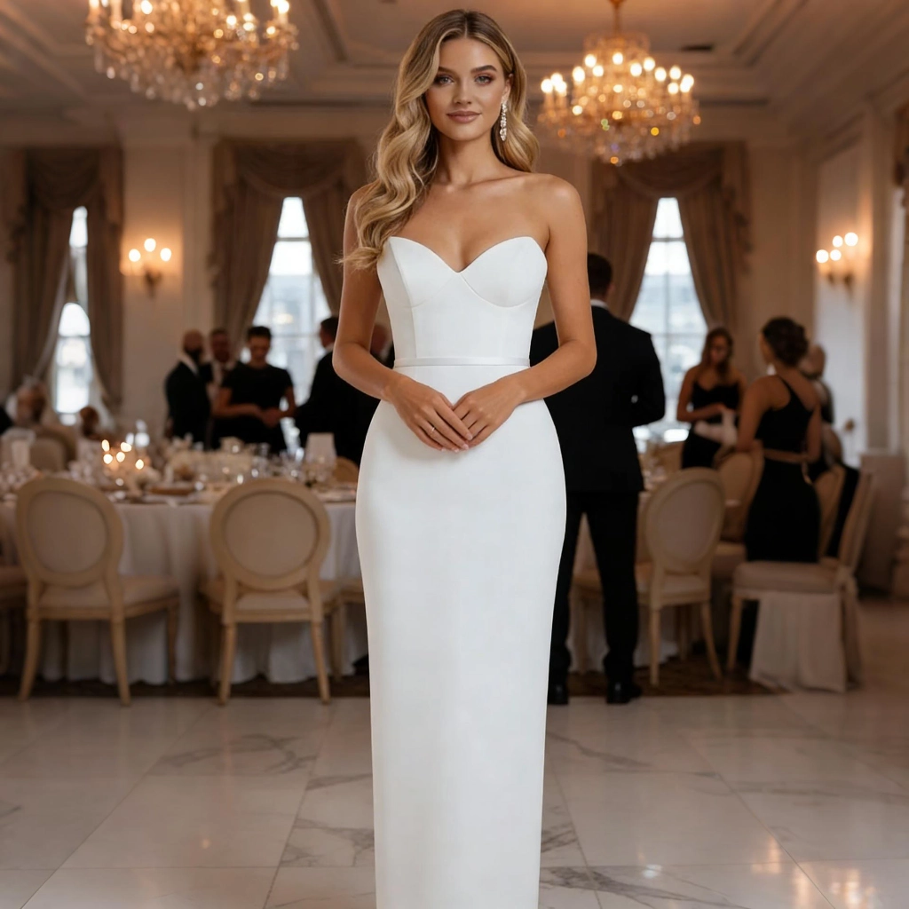 | Description | A white satin strapless sheath dress with a minimalist cinched waist and open back design. Exuding sophisticated coolness, it's the epitome of understated elegance—the standout choice for any formal occasion. | A white-based gown with blue floral accents, featuring a fitted silhouette and belted waist. The intricate print exudes elegance, making it an ideal choice for banquets and celebrations to showcase distinctive taste. | A blue-and-white color-blocked sleeveless gown, featuring intricate three-dimensional lace floral embellishments that catch the eye. Its figure-flattering silhouette accentuates elegance, making it a stylish choice to showcase your taste at banquets and celebrations. | A blue-and-white V-neck gown with short sleeves and three-dimensional floral embellishments. Its layered skirt flatters the figure, making it an elegant and distinctive choice for banquets and parties. | A rose-pink square-neck gown with a contrasting waist sash and bell sleeves adorned with pearls. Its tailored silhouette accentuates an elegant demeanor, making it a fashion-forward choice that commands attention at parties and weddings. | A purple-gray V-neck gown with bell sleeves and layered pleats, crafted from flowing fabric that exudes romance—the perfect choice for showcasing grace at evening events. |