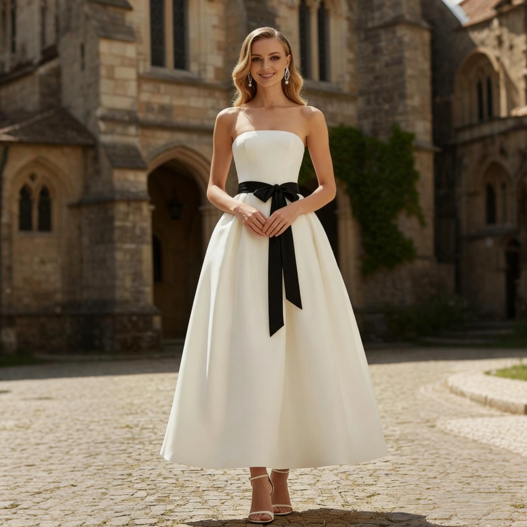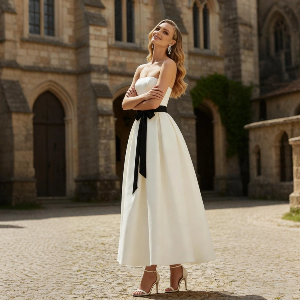 This gown seamlessly blends classic elegance with contemporary flair, radiating an undeniable presence. Crafted from off-white satin fabric, its strapless design features a black bow accent—the timeless strapless silhouette exudes sophistication, while the black bow adds a chic, modern touch. Its timeless yet distinctive style makes it an ideal choice for vintage weddings, formal dinners, or chic parties. Classic yet individualistic, this gown masterfully showcases feminine grace and contemporary flair through its satin elements and black bow detailing.