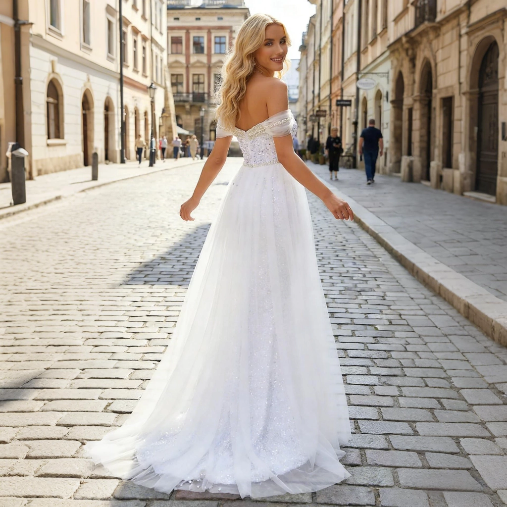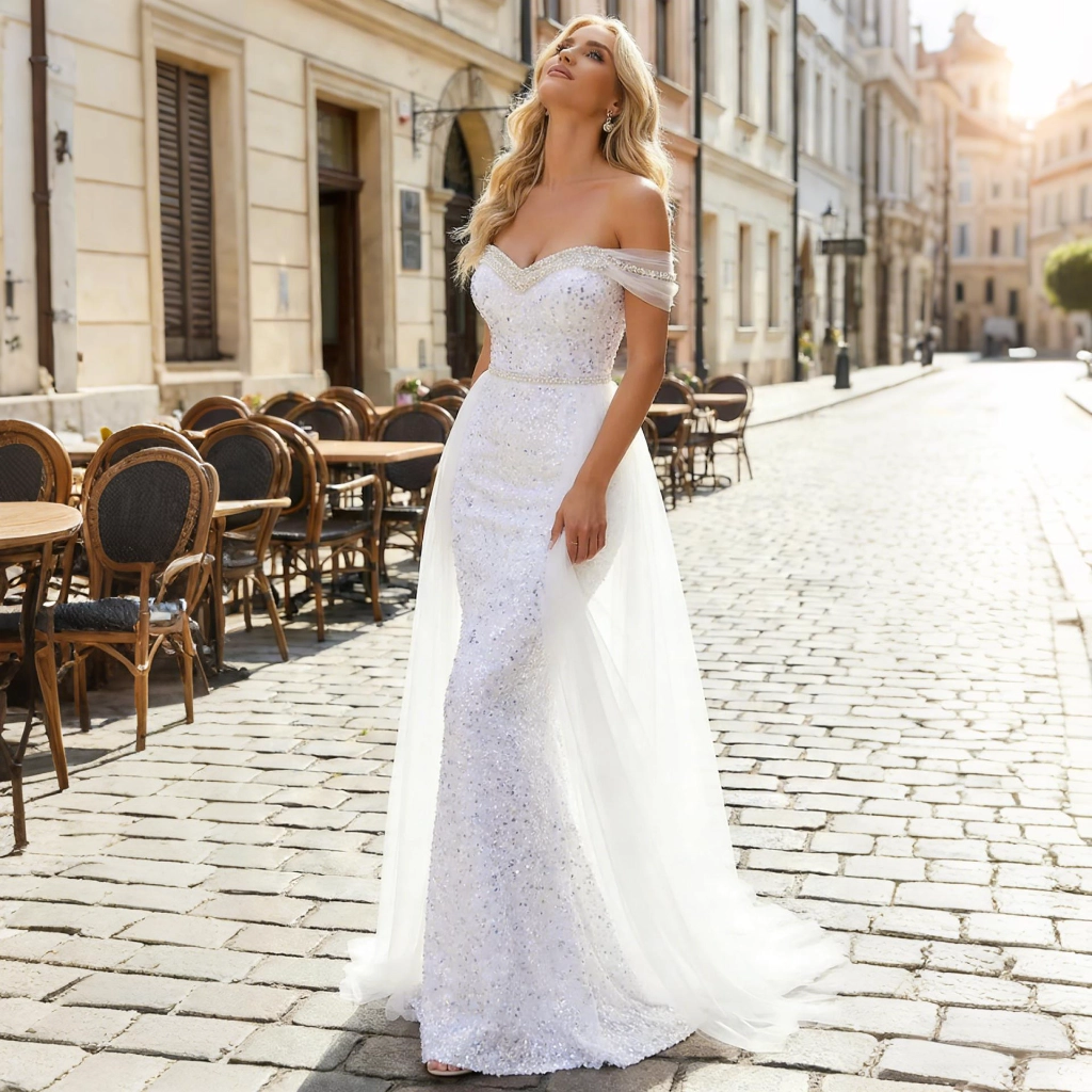 | Description | A white sequined strapless wedding gown with a train, featuring a tulle cape and a fitted silhouette. Dreamy and dazzling, it is the ethereal main gown that combines elegance and glamour for the wedding. | A nude pink lace gown with three-quarter sleeves, adorned with three-dimensional floral appliqués and a large bow. Its layered skirt exudes romantic elegance, making it the perfect choice for weddings and formal dinners to showcase feminine grace. | Navy blue fishtail gown with a square neckline and sculpted pleats. The fitted skirt accentuates curves, making it a stylish choice to showcase elegance at formal events. | Navy blue one-shoulder gown with lace sleeves adorned with three-dimensional floral appliqués. The full skirt silhouette exudes elegance and grandeur, while exquisite details showcase your luxurious taste at the gala. | A nude pink gown with a tulle shawl and tailored silhouette—its unique design radiates romance, making it the perfect eye-catching piece to transform you into an ethereal fairy at the gala. | A light blue one-shoulder gown with long sleeves and a jeweled bow exudes understated elegance, making it an ideal choice for formal occasions to showcase a gentle and refined demeanor. |